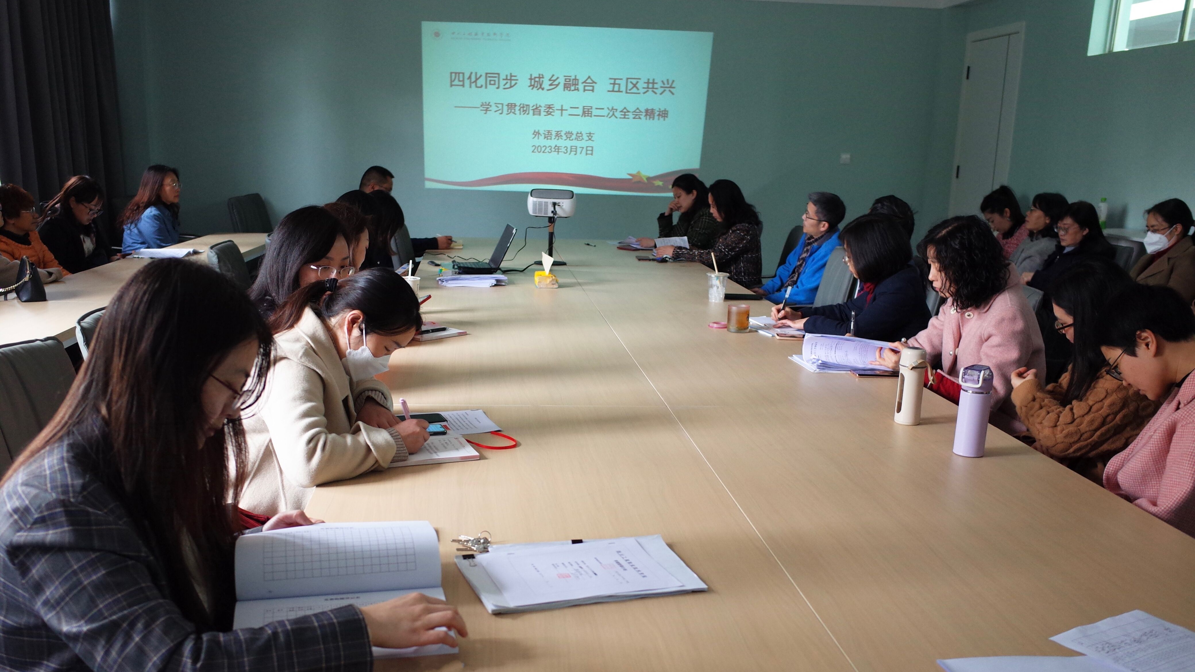 根据《中共四川省经济和信息化厅直属机关委员会转发〈关于学习宣传贯彻省委十二届二次全会精神的通知〉的通知》,外语系党总支认真组织全系党员同志进行学习,结合实际抓好贯彻落实,朱英书记从教育教学、数字化、外贸、巴蜀文化四个层面解读了全会精神,指出外语系未来发展方向,全省外贸稳定增长对商务英语专业拓展带来的契机以及教师个人提升专业水平应对数字化经济带来的挑战和机遇。