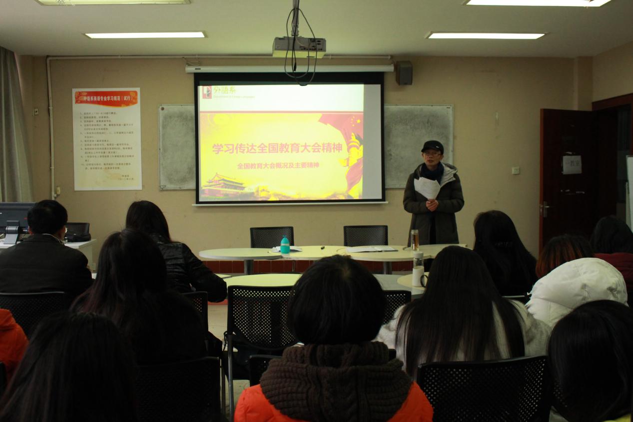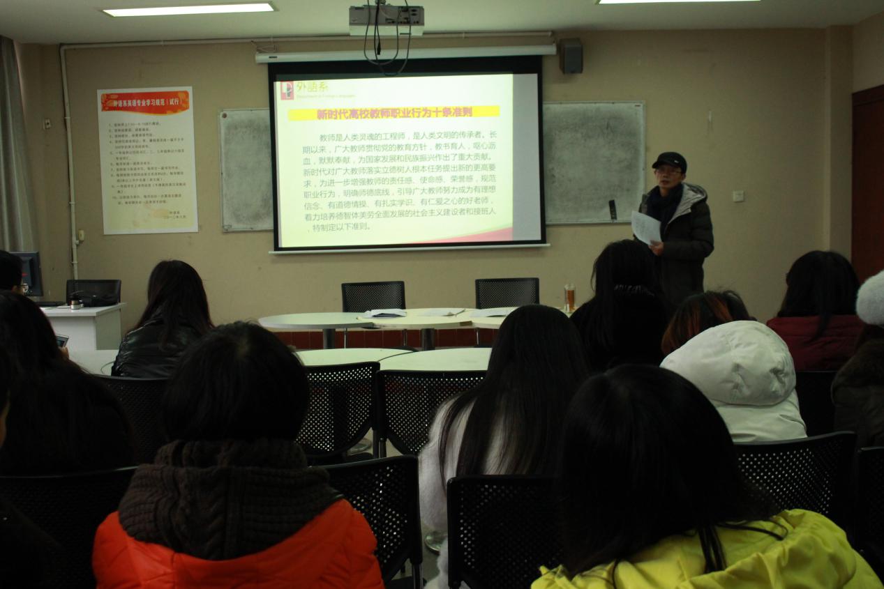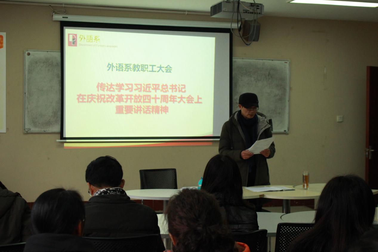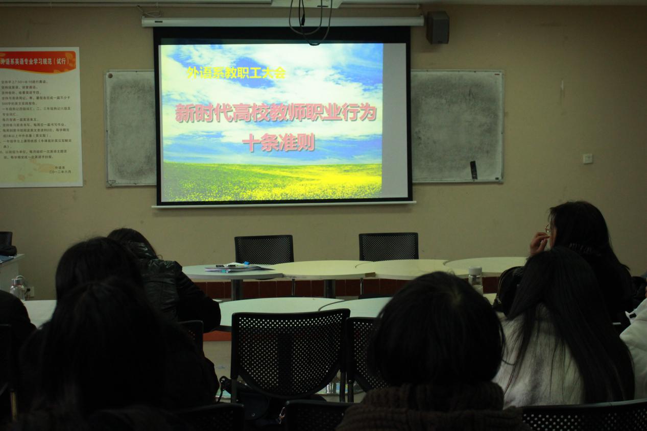 2019年1月9日下午,外语系党总支组织全系教职工在语言中心教室开展政治学习会,会议由党总支书记卢敏主持。本次政治学习会主题为:进一步学习贯彻习近平在庆祝改革开放40周年大会上的重要讲话和全国、全省、全市教育大会精神及学习贯彻《新时代高校教师职业行为十项准则》。