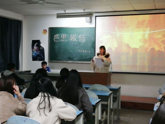 商务英语专业的同学在班主任带领下,重温了心怀感恩的意义与诚信的内涵,从“滴水之恩,涌泉相报”到“衔草结环,以谢恩泽”,再到“乌鸦反哺,羔羊跪乳”,生动的例子闪烁着感恩的光辉。班会临近尾声时,同学们齐声朗读与感恩诚信有关的诗歌,气氛温馨融洽。