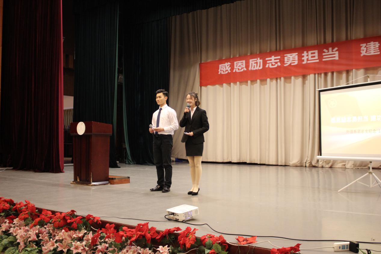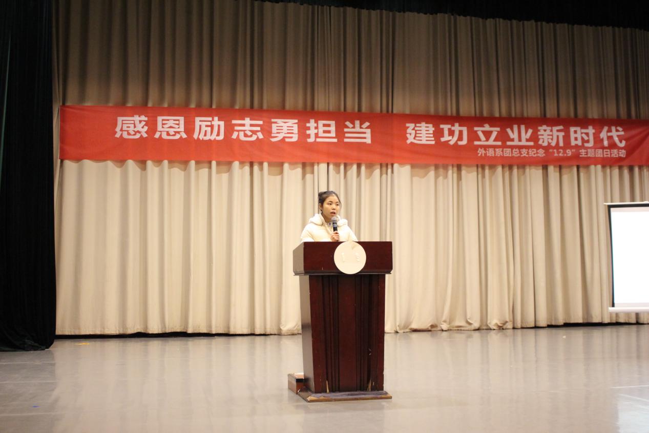 为全面学习贯彻党的十九大精神,纪念“一二·九”青年学生爱国运动83周年,弘扬爱国奋斗精神,增强青年大学生的责任感、使命感,外语系团总支于12月9日在二教演讲厅开展“感恩励志勇担当,建功立业新时代”主题团日活动。学院党委委员、学工部部长、学生处处长龙斌老师、学院学生处副处长、学院资助中心主任李秀平老师、学院团委书记王春焱老师、外语系党总支书记卢敏老师、外语系主持工作副主任苏玉仙老师、外语系副主任蒋显伦老师及外语系各班班导师、班主任和辅导员老师应邀出席,外语系全体团员和青年大学生参加。