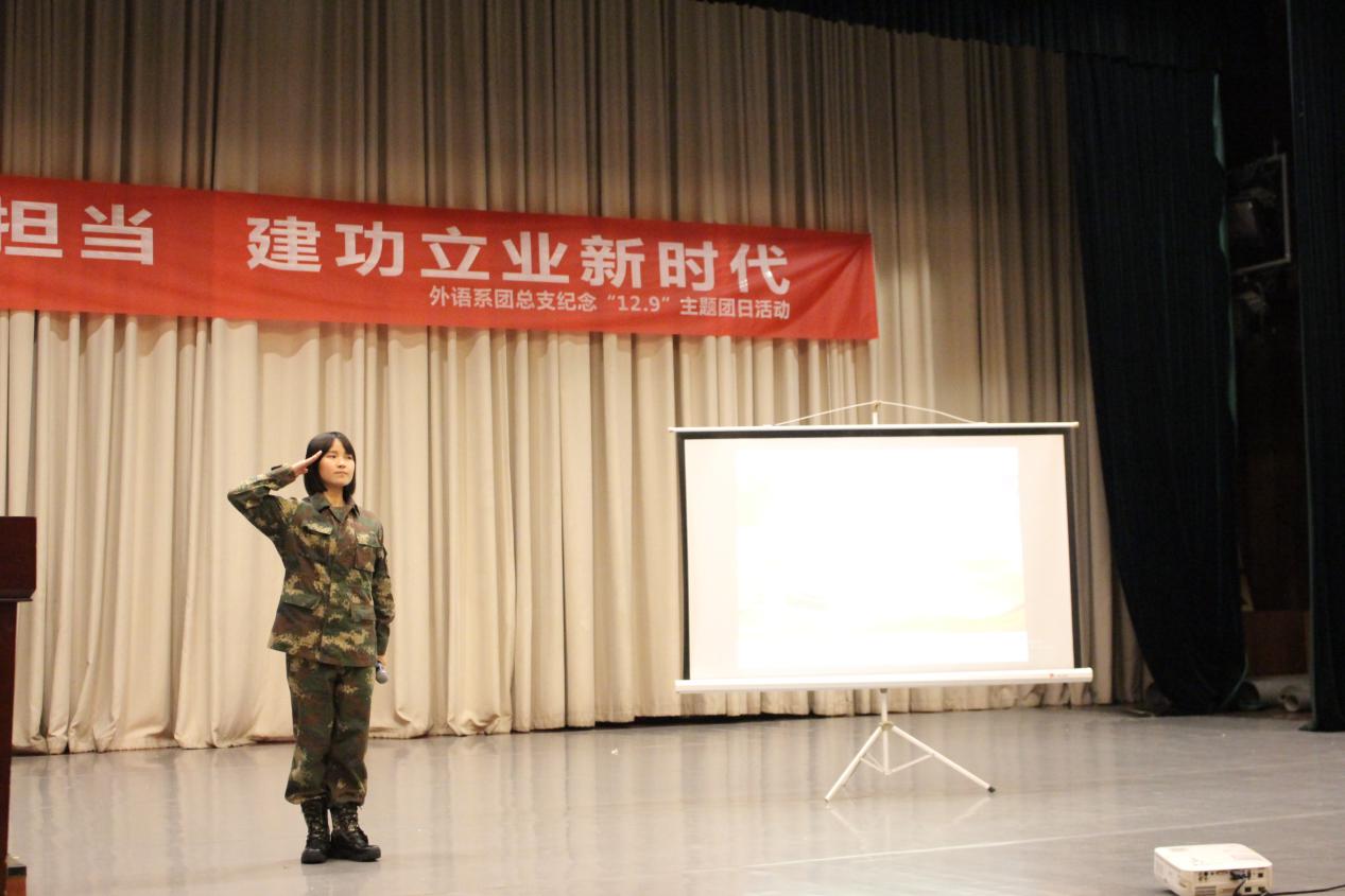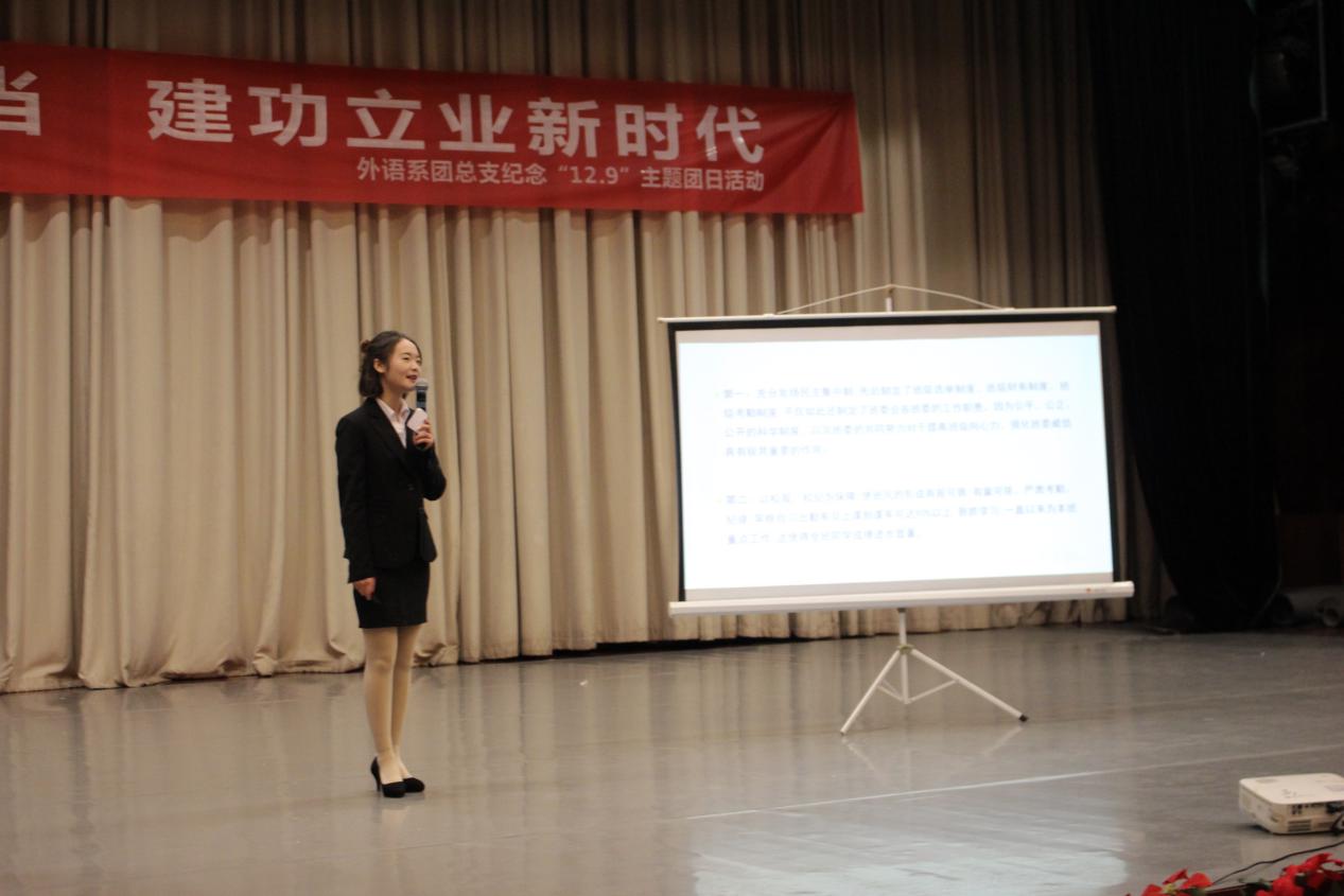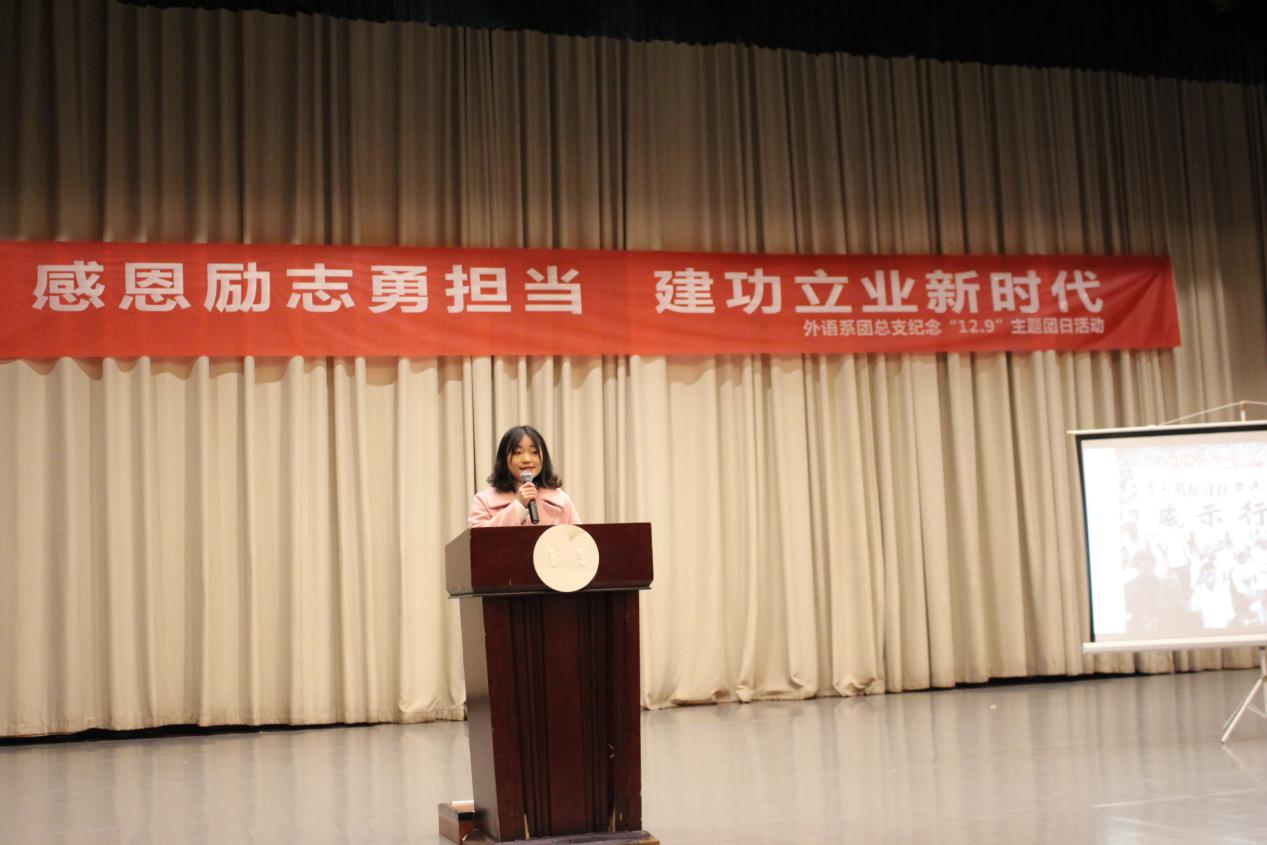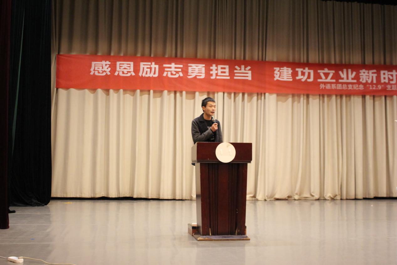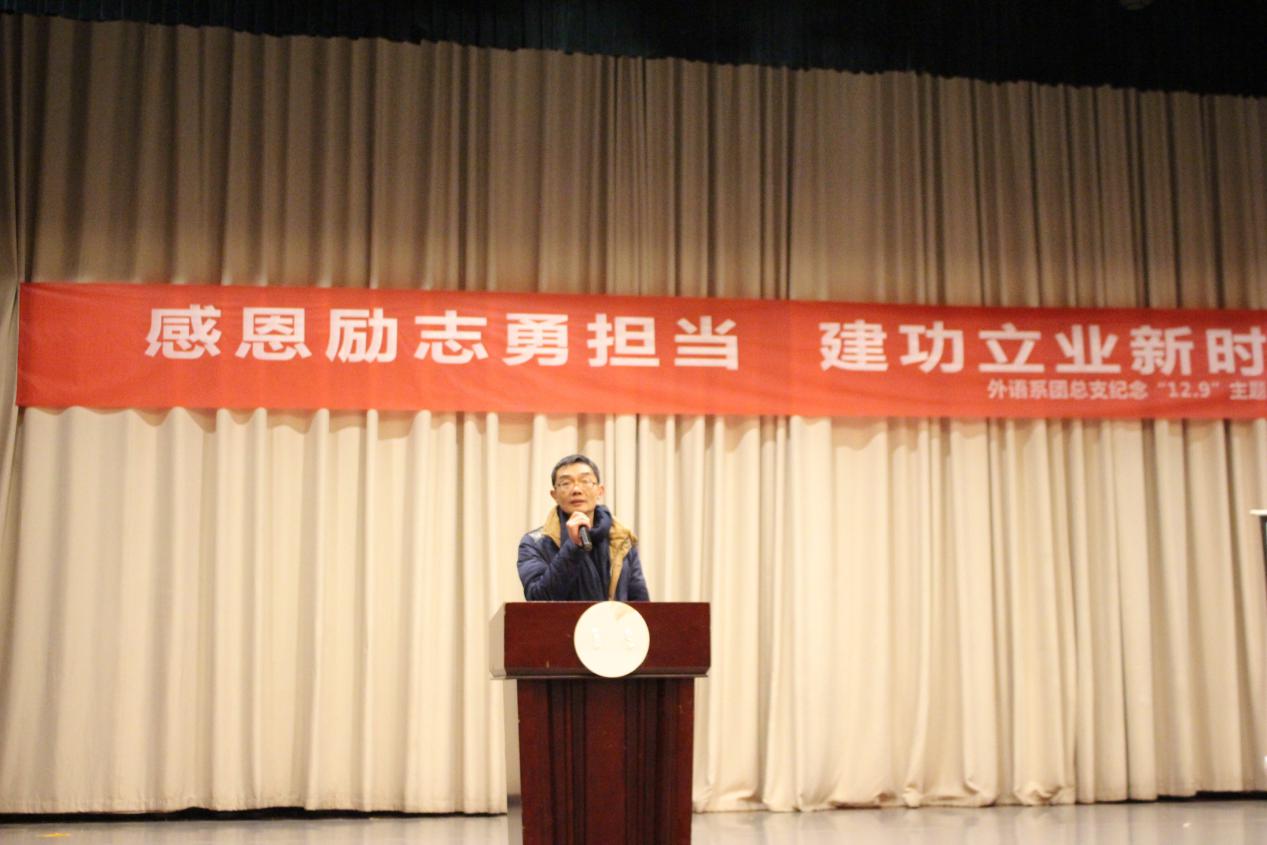最后,外语系党总支卢敏书记发表了热情洋溢的总结讲话。他指出,83年前我们的先辈们在国家生死存亡的关键时刻,勇于担当,挺身而出,掀起了“12.9”爱国学生运动,促进了中国人民的觉醒,而今天,在以习近平同志为核心的党中央的坚强领导下,“中国号”巨轮正向着中华民族伟大复兴的中国梦不断奋进,作为新时代的青年,我们有责任、有义务为实现中华民族的伟大复兴,为这辉煌的征程贡献力量。卢书记殷切的希望同学们,要勇敢的站在新时代的前沿,感恩励志勇担当,以艰苦奋斗、锲而不舍的精神,建功立业新时代。
