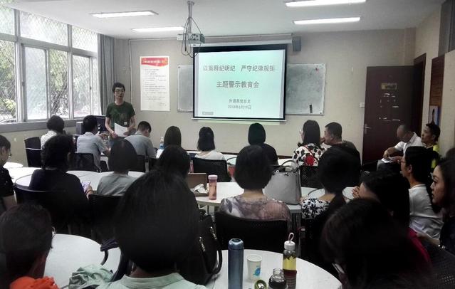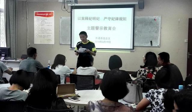 为深入贯彻落实省纪委十一届二次全会精神,充分发挥反面典型案例的警示教育作用,推动全面从严治党向纵向发展,按照学院纪委“开展主题警示教育月活动”的要求,6月19日下午,外语系党总支在语言中心教室组织全体党员和教职工开展了“以案释纪明纪 严守纪律规矩”专题教育会,会议由系党总支书记卢敏主持。