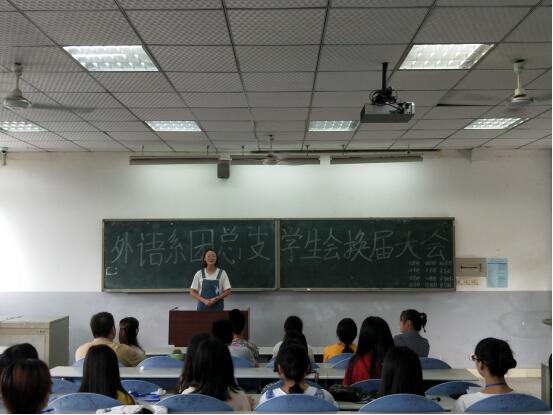 大会第二项,新一届的干事们各自发言。新一届学生会主席杨睿说,首先感谢大家对他能力的肯定,很荣幸能够成为外语系的学生会主席,其次表达了对外语系团总支学生分会建设的美好期望。团总支副书记万黄梅提到,在以后的工作中,如果发生矛盾,大家应共同处理,和平解决问题。