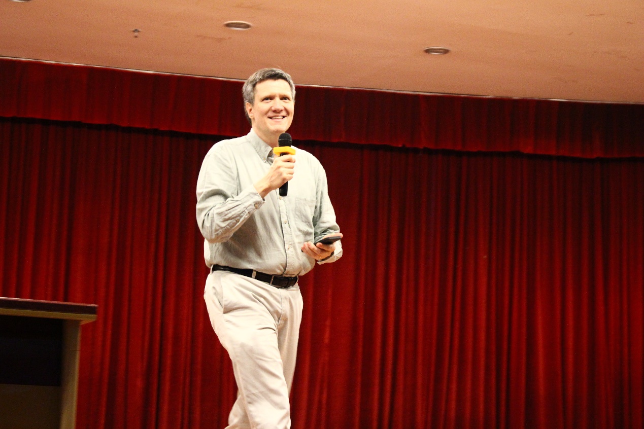 董江教授早年毕业于中国科学技术大学,后赴美深造,获分析化学博士和工商管理硕士学位,现在密苏里大学任教。讲座前,他问了三个问题:1、美国的孩子在18岁后,家长是否不管;2、中国孩子上大学,家长是否会支付学费;3、美国孩子上大学家长是否会支付学费。台下师生积极讨论,中美双方同学各持己见,董教授由此引出中美在文化教育理念上的差异。之后,他以赴美留学生的身份,从专业选择、完成学位的时间跨度自由、班级设立、交流互动、大学学费和勤学俭工等方面,讲述他走出国门后看到的差异,感受到的不同。