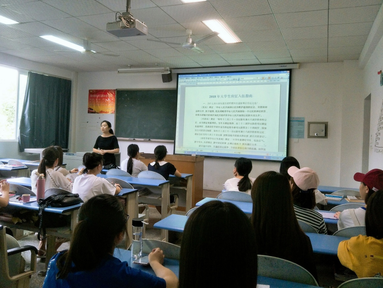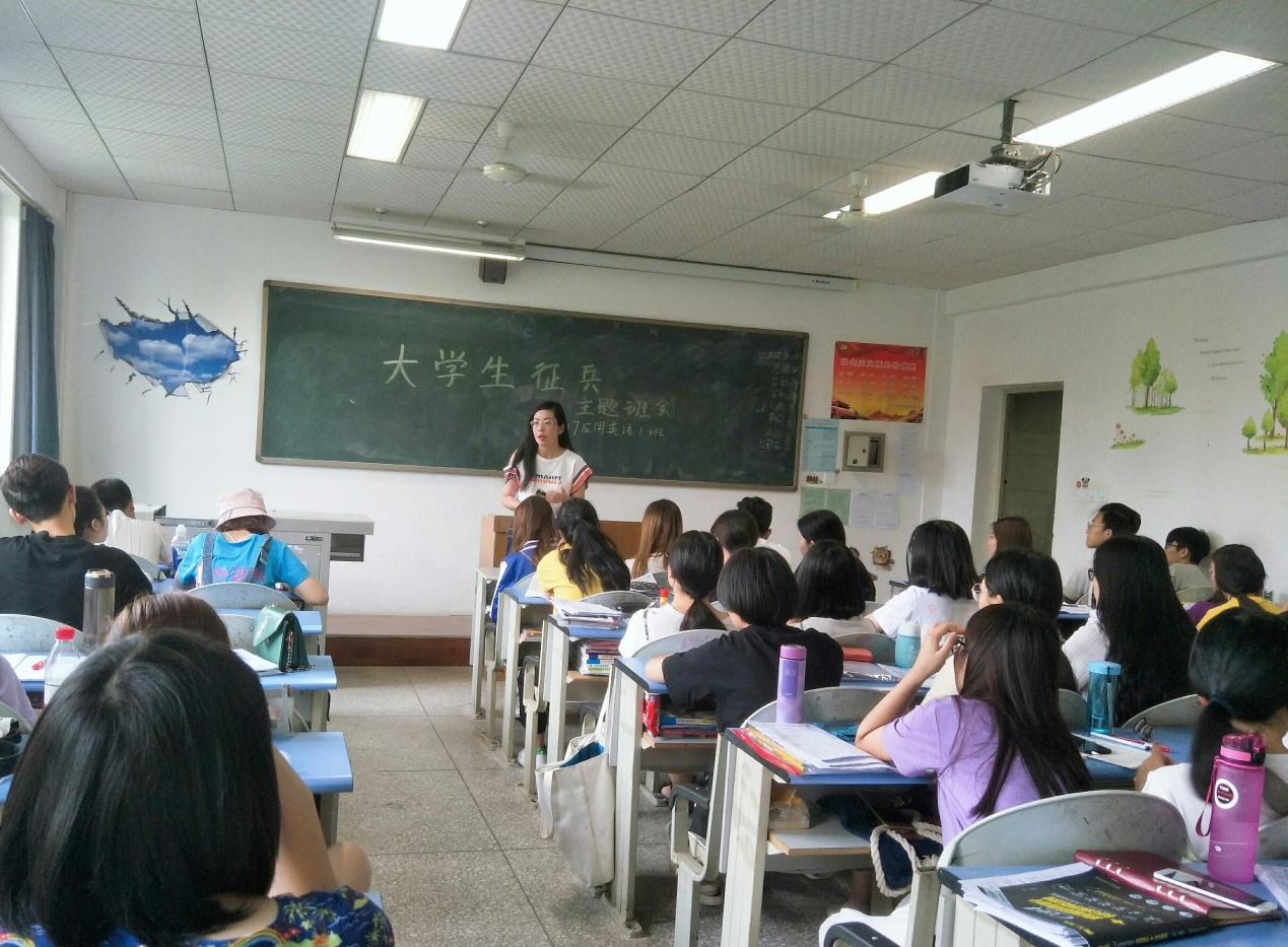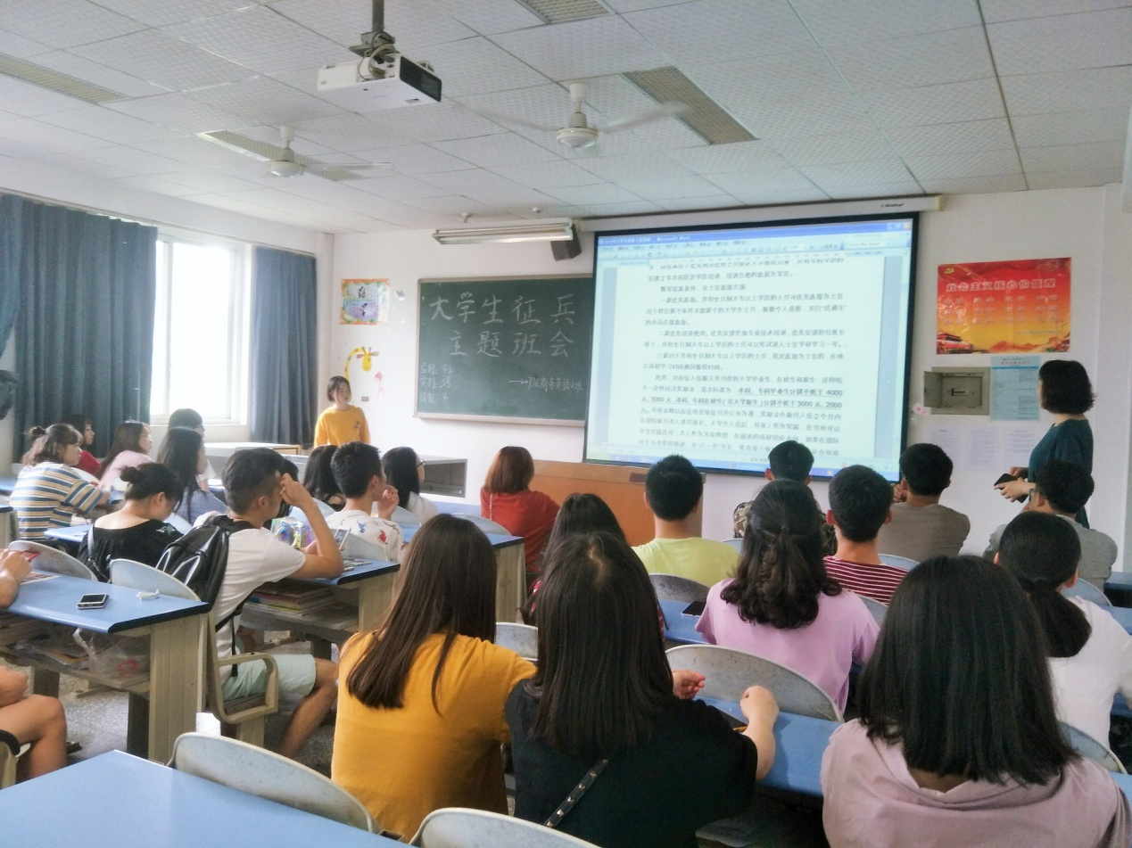 外语系副主任苏玉仙老师在2017级商务英语1班为学生们进行了讲解,她把“大学生征兵入伍”有关政策传达给了每一位同学,激发了同学们积极参与应征入伍的热情。