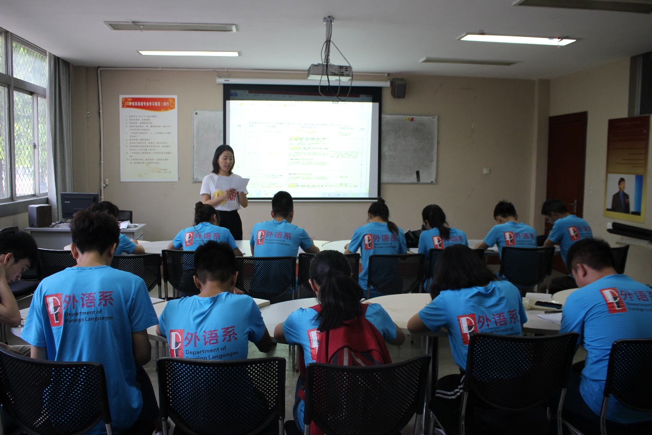 2018年5月18日下午4:30,第三次中方志愿者大会暨动员会在语言中心举行。16名志愿者精神抖擞,穿着印有外语系标志、志愿者英文字母的蓝色服装参加会议。大会由胡晓老师主持,特邀外语系党总支书记卢敏老师、外语系副主任苏玉仙老师出席。