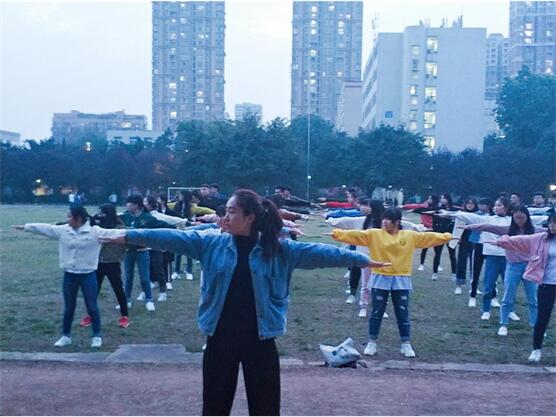 外语系的同学们纷纷涌跃报名参与,积极投入到健身活动之中。伴随全国第九套广播体操音乐的响起,同学们衣着整齐、精神饱满,一个个昂首挺胸,伸臂、扩胸、转体、踢腿、弯腰……每一个动作都娴熟到位。一招一式张弛有度,充盈着刚健之美,洋溢着青春的气息。