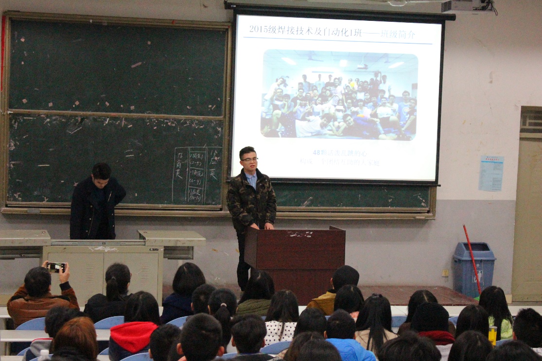 12月13日晚上7:30外语系在3A109召开了先进班集体宣讲会,除了我系的先进班集体(2015级应用英语1班及2016级商务英语1班)班长杨璐、袁欣同学宣讲外还邀请了材料系2015级焊接技术及自动化1班柏宇宇同学和建筑系2015级园林工程技术1班唐皓星同学两位先进班集体班长来为我系同学宣讲交流。
