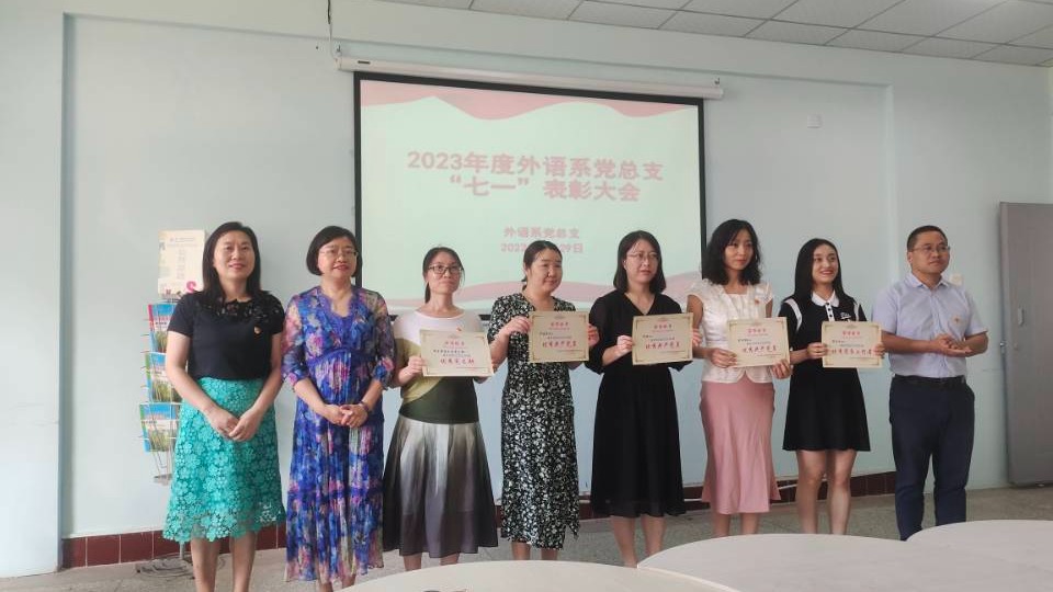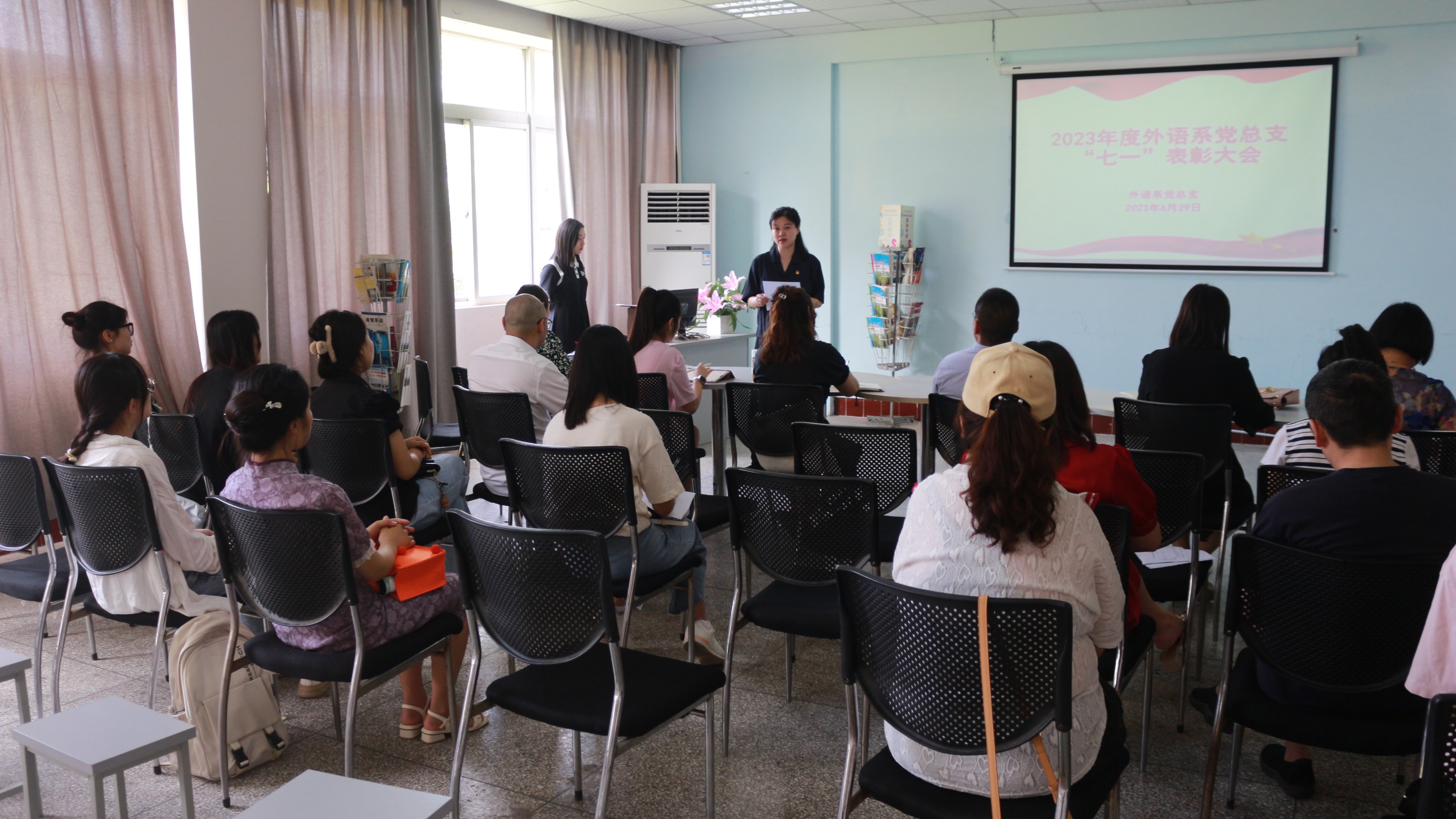 为进一步弘扬伟大建党精神,激励党员坚定理想信念,充分发挥先进典型的示范引领作用,外语系党总支于6月29日下午3点在二教南306党建活动室召开党员大会暨“七一”表彰大会。会议由系党总支组织员邓斯文主持,外语系全体师生党员同志到场参会。
