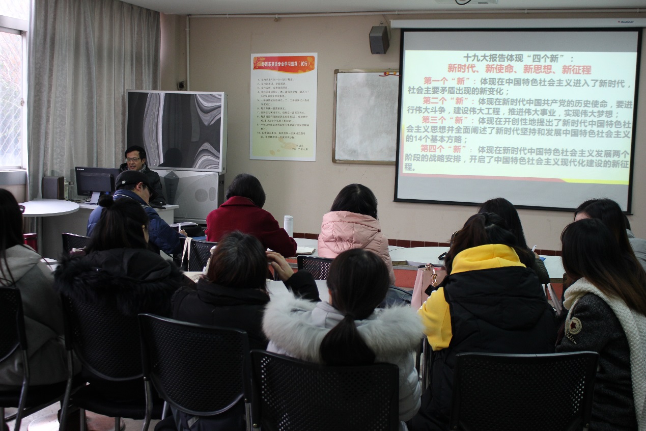 2018年1月2日下午在语言中心,外语系全体党员参加了“新时代新使命新思想新征程”学习讨论会。会上,我系党总支宣传委员邹和成老师对“四个新”进行了全面阐述,党员们都认真学习和深刻体会了十九大精神。