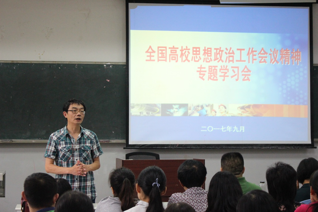 会上,院长助理向桢同志组织大家学习了习近平总书记在全国高校思想政治工作会议上的讲话精神。同时,系部党总支卢书记带领大家学习了《中共中央 国务院关于加强和改进新形势下高校思想政治工作的意见》和《中共四川省委 四川省人民政府关于加强和改进新形势下高校思想政治工作的实施意见》两份文件,并就我系教师和学生实际情况进行分析,强调了提升师生思想政治素质、发挥哲学社会科学育人功能及课堂教学建设管理加强等的重要性。