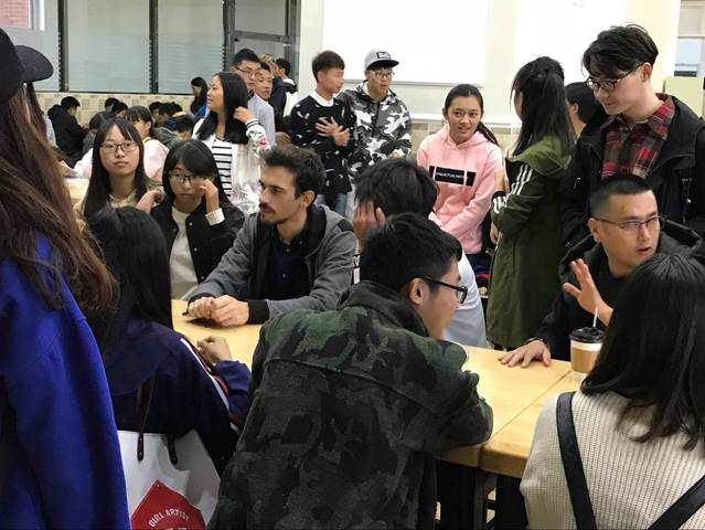 为活跃同学们学习英语的氛围,提高同学们的英语口语表达能力,增强同学们之间的交际能力,丰富同学们的业余生活,本学期第一次英语角活动在学院新区咖啡厅外露台上如期举行了。星期二,天空飘着蒙蒙细雨,工程学院变得烟雨迷离,却丝毫阻挡不了同学们的热情,参加人数将近百人。刚开始大家还有些拘谨,外教Ainsley来了之后,气氛一下子活跃起来。Ainsley给大家带来了好玩的游戏,在他的带动下,同学们争相发言、表演节目,场面火爆。学生们表示,英语角给了他们锻炼口语的机会,更让他们了解到外国人独特思维与文化差异,为自己跨文化交际奠定良好的基础,同时这种寓教于乐的方式也让学生受益颇多,也欢迎更多爱好英语的同学加入。