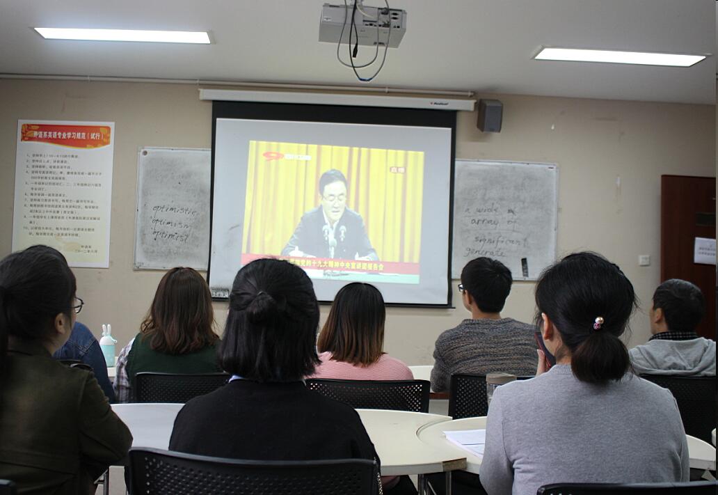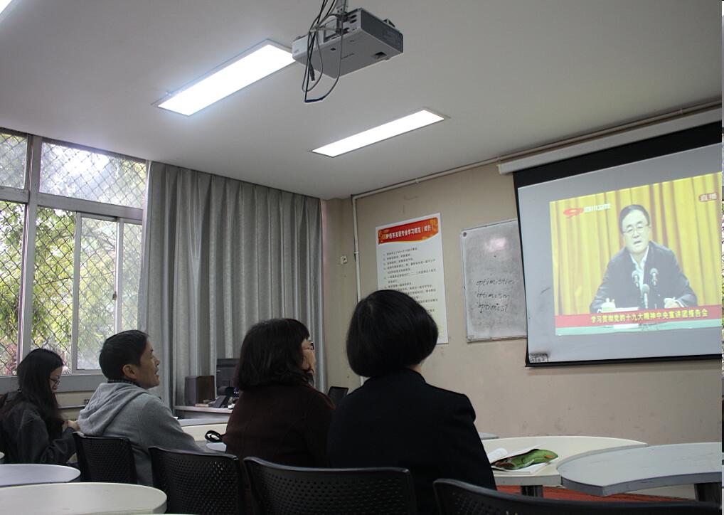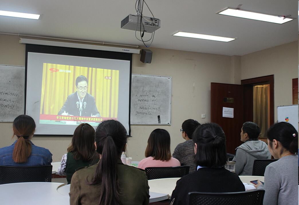 11月8日上午9点,外语系党总支组织教职工在二教语言中心教室一起观看了四川卫视直播的《学习贯彻党的十九大精神中央宣讲团报告会》。中央宣讲团成员、中央党史研究室主任曲青山作宣讲报告。