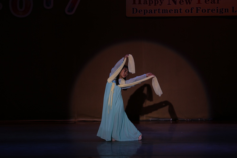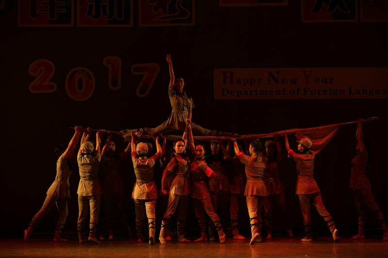 晚会创意连连,形式多样,掌声笑声不断。歌曲合唱《If you》,2016级旅游英语班演绎的话剧《九儿》,2016级商务英语班表演的小品《凑一坨》,将晚会气氛推向高潮。在学校第十五届艺术节荣获三等奖的舞蹈《无名花》带给大家美的享受、视觉的冲击和情感的震撼。外语系的新老外教也热情加入表演中,Ellie和Nora一段清唱的经典英文歌曲《Jingle Bells》,带给全场满满的圣诞温暖。师生同台贺新年,也少不了教师的表演,在2016级学生的伴舞下,两位外语系教师带来的歌曲《听是谁在唱歌》,赢得满堂喝彩。