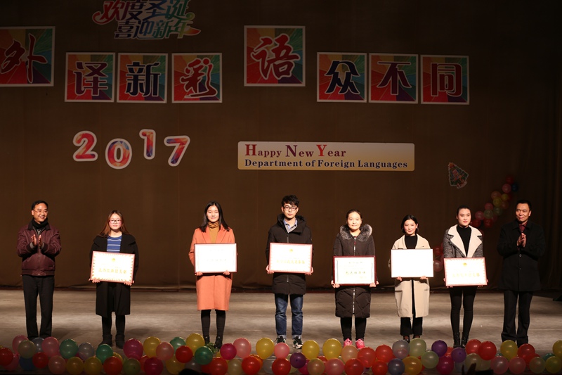 迎新晚会群星灿烂、活力四射,令人流连忘返,是一个师生同乐的不凡之夜。外语系副主任苏玉仙发表了热情洋溢的英文致辞,回首往昔,展望未来,寄语对即将离校的大三学子们的美好祝福。晚会的“重头戏”——年度颁奖典礼在热烈的掌声中隆重举行,对一年来综合表现优异、素质拓展成绩突出的先进班集体和优秀个人颁发奖状,向第九届系团总支学生会的优秀学生干部们颁发证书,对优秀学生干部和干事及优秀教师进行表彰。