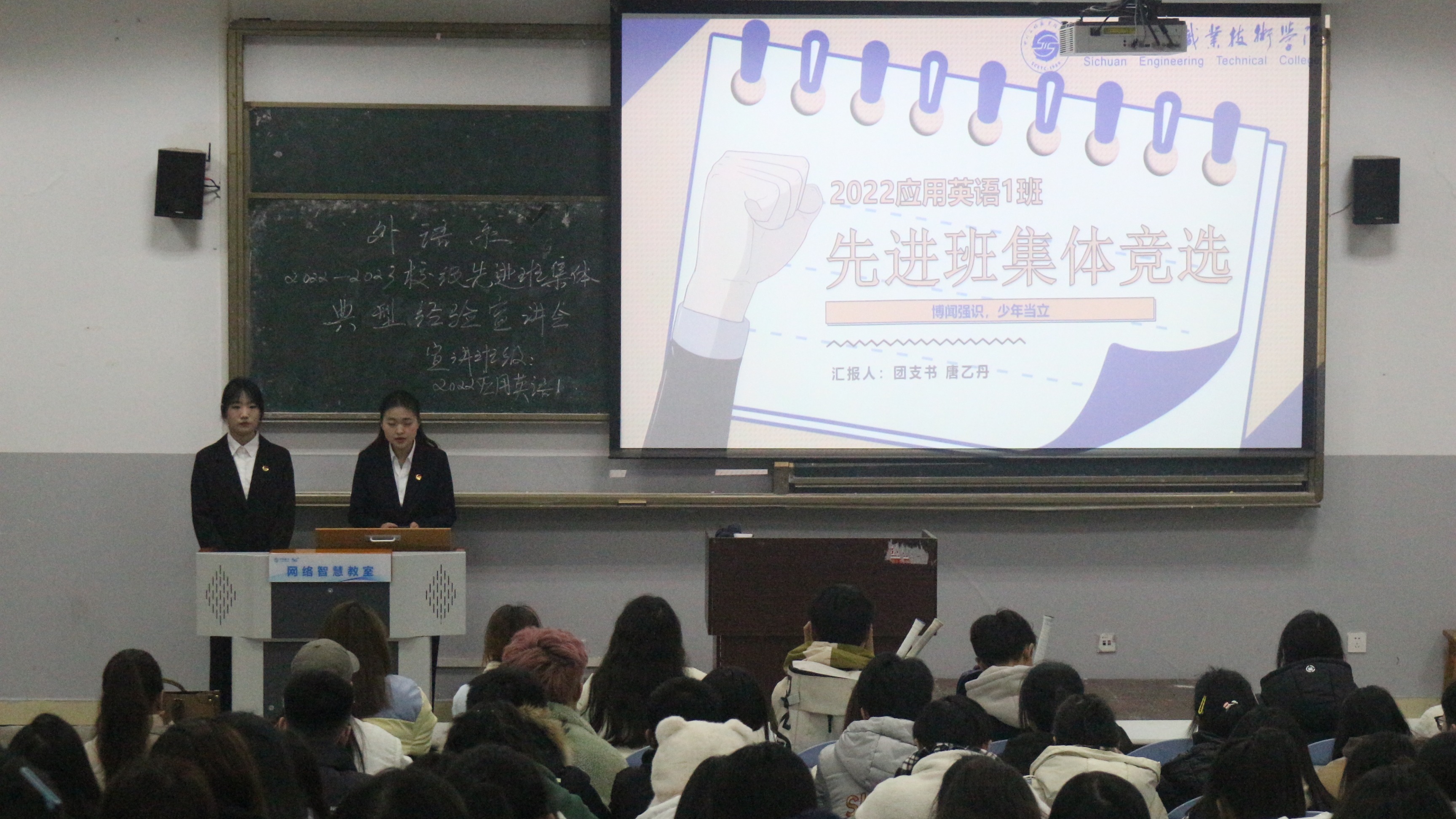 为全面推进我系优良学风建设,充分发挥先进班集体在学风建设方面的示范引领作用,外语系于12月28日晚上7:30在3A109召开了先进班集体宣讲会,我系的先进班集体2022级应用英语1班班长徐金凤、团支书唐乙丹同学进行宣讲,展示了班级优秀风采,分享了学风及班级建设经验。外语系学工组长邓锋老师,外语系22级辅导员孙宁老师、外语系23级辅导员司园园老师到场参会。