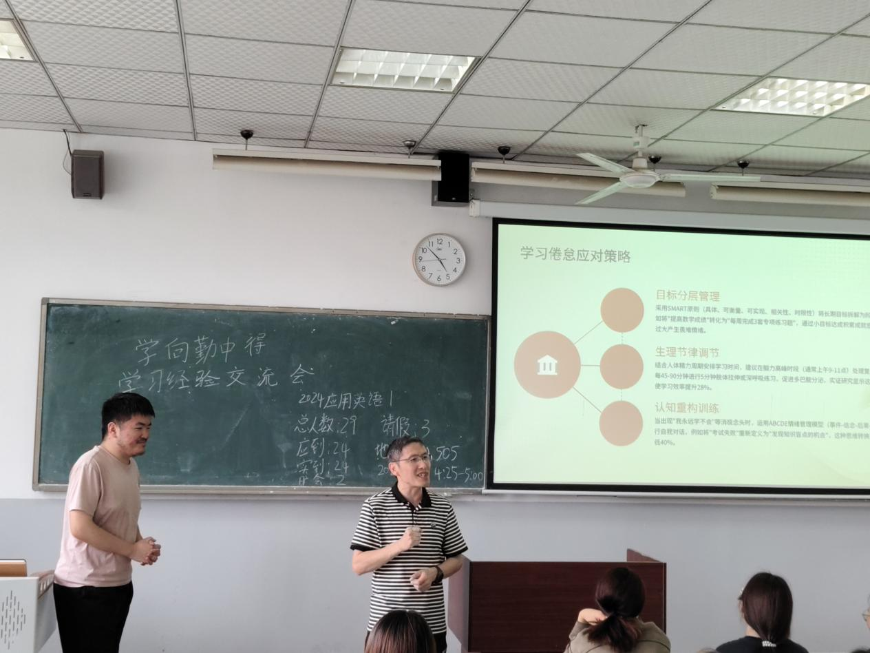 2025年5月27日,外国语学院2024应用英语1班的同学们在3A505教室开展了学习经验交流会。此次交流会旨在通过分享高效学习方法、时间管理策略以及心理调适技巧,帮助同学们在学业上取得突破,实现个人全面成长。本次交流会特邀请了蒋显伦教授为同学们进行了分享。