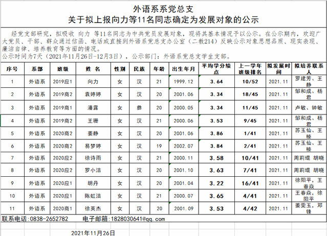 外语系党总支 关于拟上报向力等11名同志确定为发展对象的公示