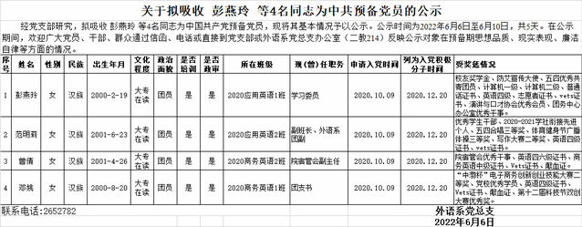 外语系党总支 关于拟上报 彭燕玲 等4名同志确定为发展对象的公示