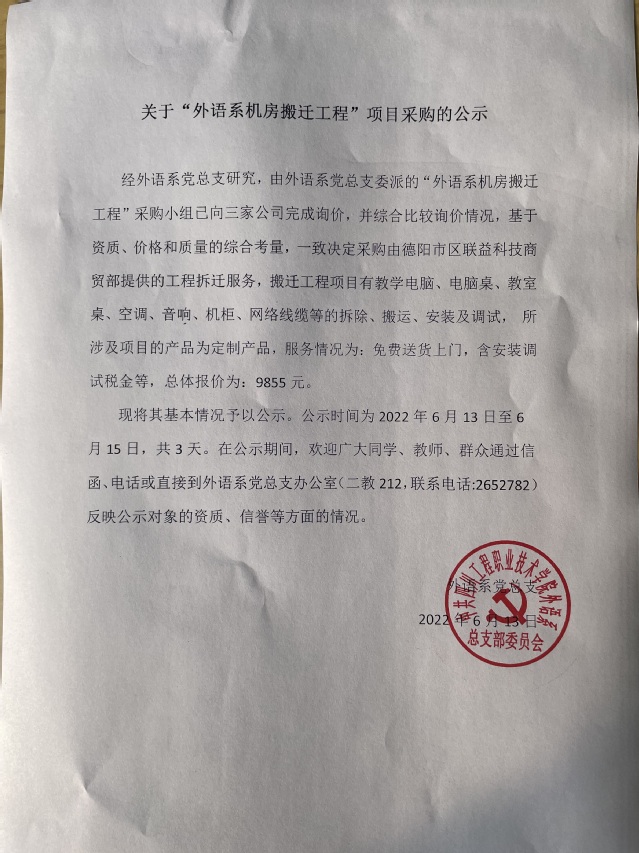 关于“外语系机房搬迁工程”项目采购的公示