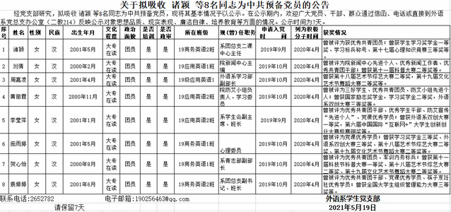 关于拟吸收 诸颖 等8名同志为中共预备党员的公告