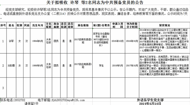 关于拟吸收 许琴 等2名同志为中共预备党员的公告