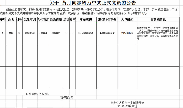 关于 黄月同志转为中共正式党员的公告