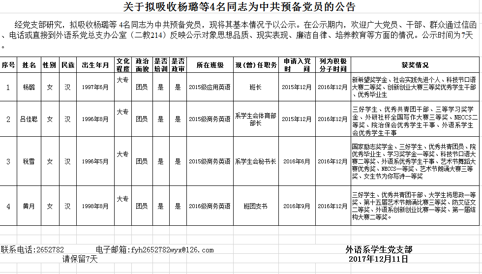 关于拟吸收杨璐等4名同志为中共预备党员的公告
