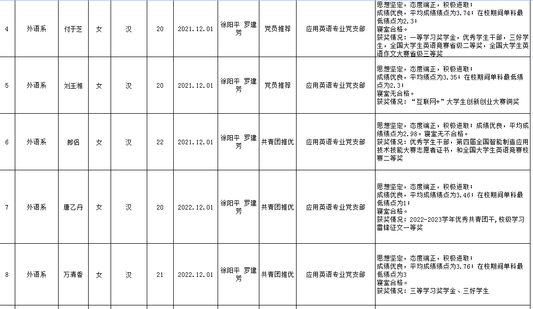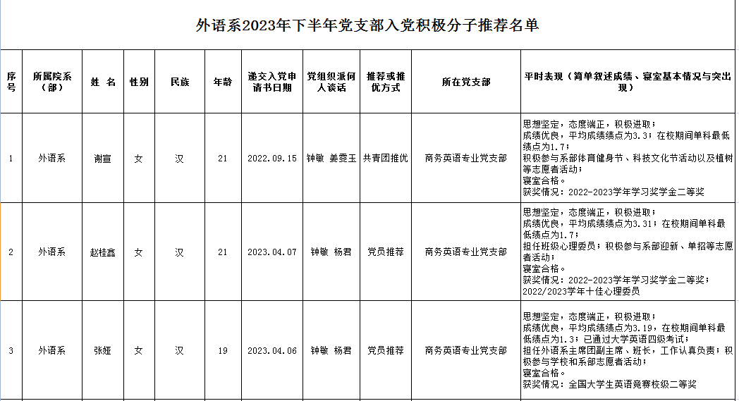 经党支部研究,拟将谢宣等8名同志列为入党积极分子,现将其基本情况予以公示。公示时间为2023年10月13日至10月17日,共5天。在公示期间,欢迎广大党员、干部、群众通过信函、电话或直接到党支部或外语系党总支办公室(二教南304) 反映公示对象在思想品质、现实表现、廉洁自律等方面的情况。