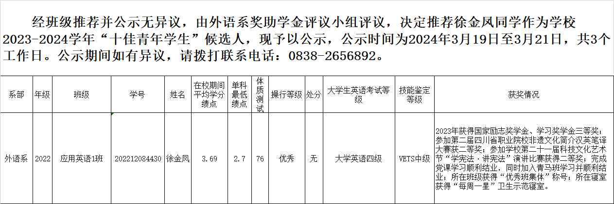 外语系2023-2024学年“十佳青年学生”推荐名单公示