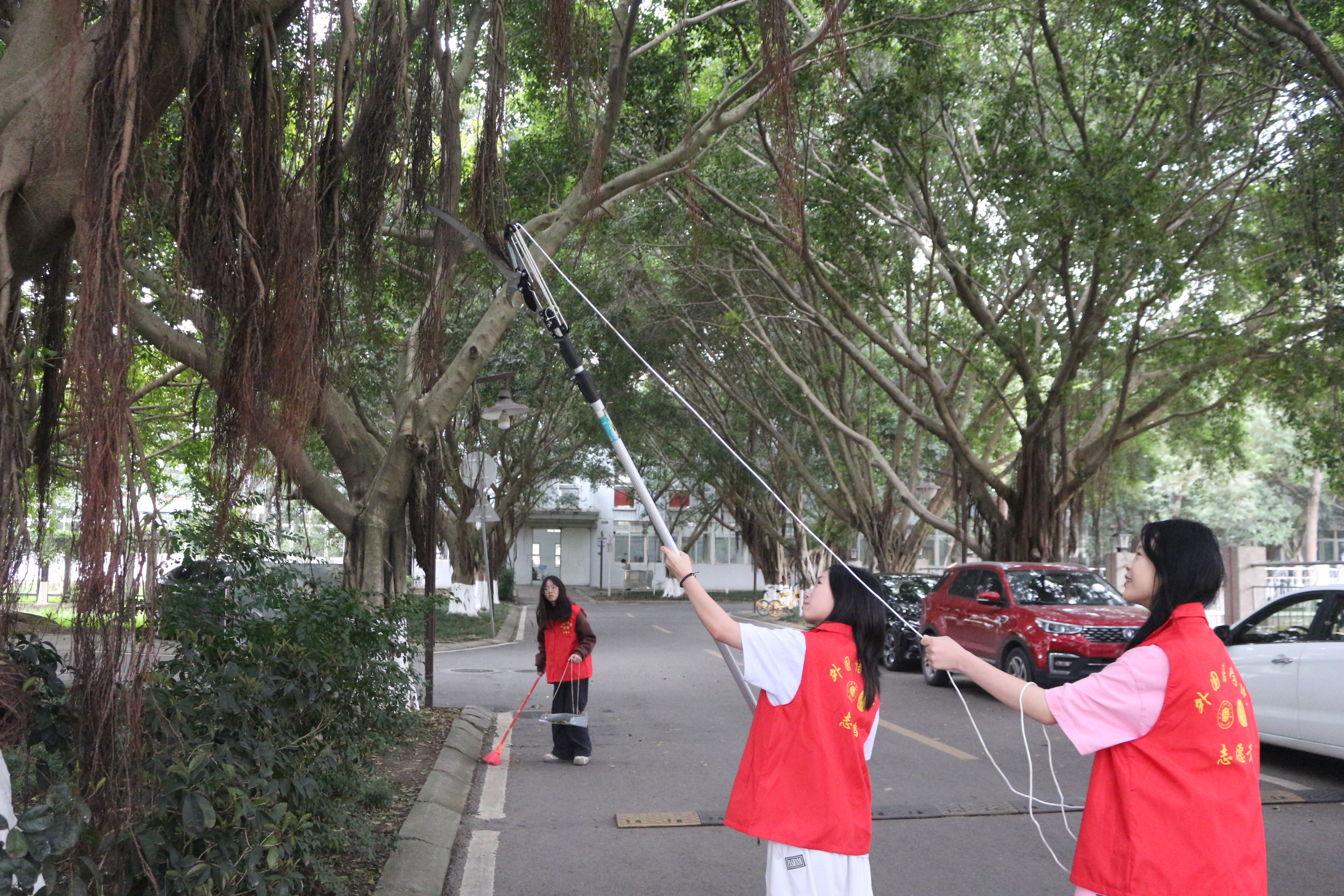 下午3时,师生们准时在第二教学楼西侧集合。师生们分成4个小组,有序开展护绿工作。活动现场,师生们热情高涨,分工协作:有的为树木浇水培土,确保植被得到充足养分;有的仔细清理草坪杂草,维护绿化带整洁;有的清扫道路落叶,保持校园环境优美;还有的修剪枯枝,促进树木健康生长。整个劳动区域覆盖第二教学楼西面、南面及东面的草坪、树木和道路。
