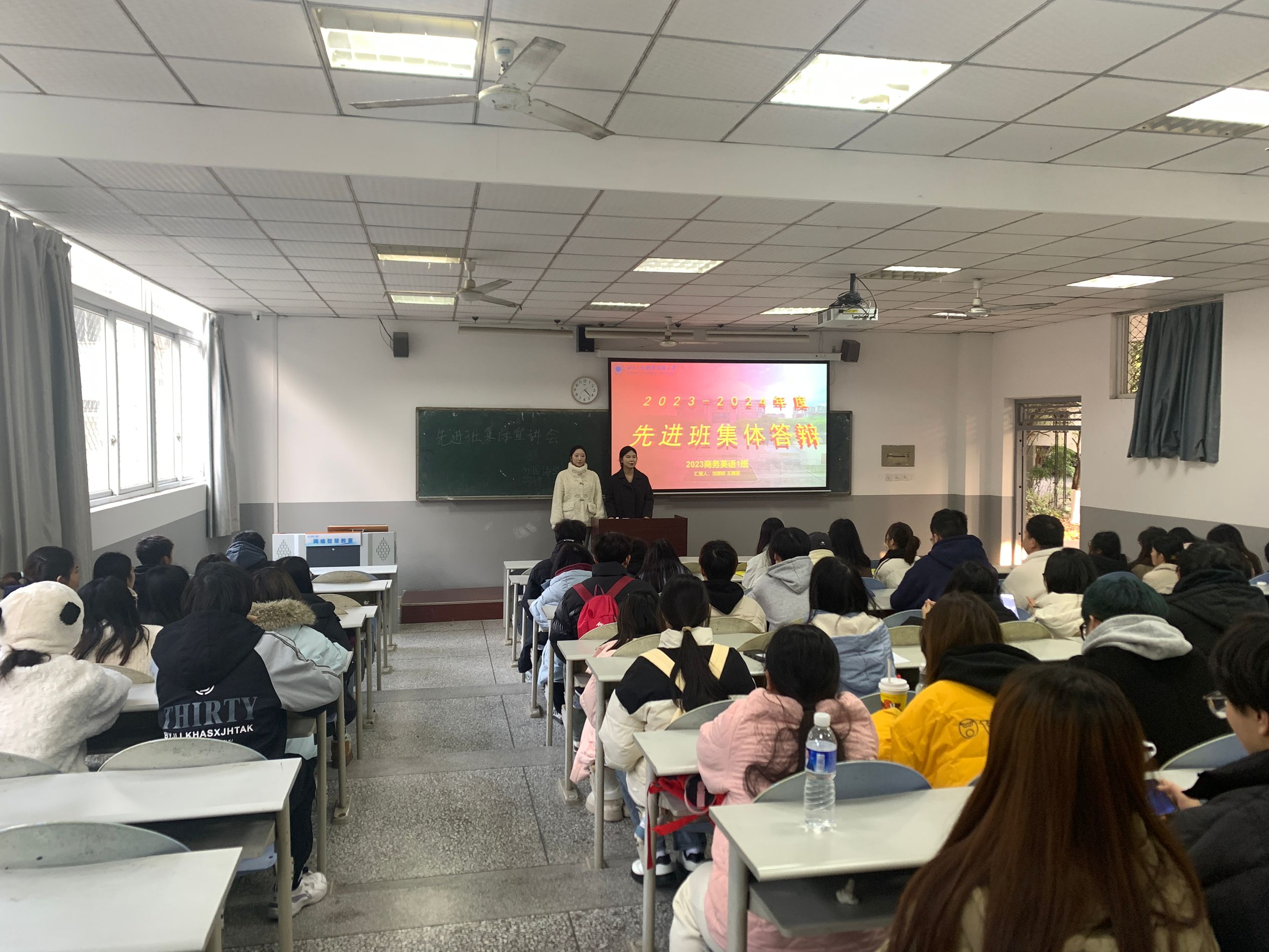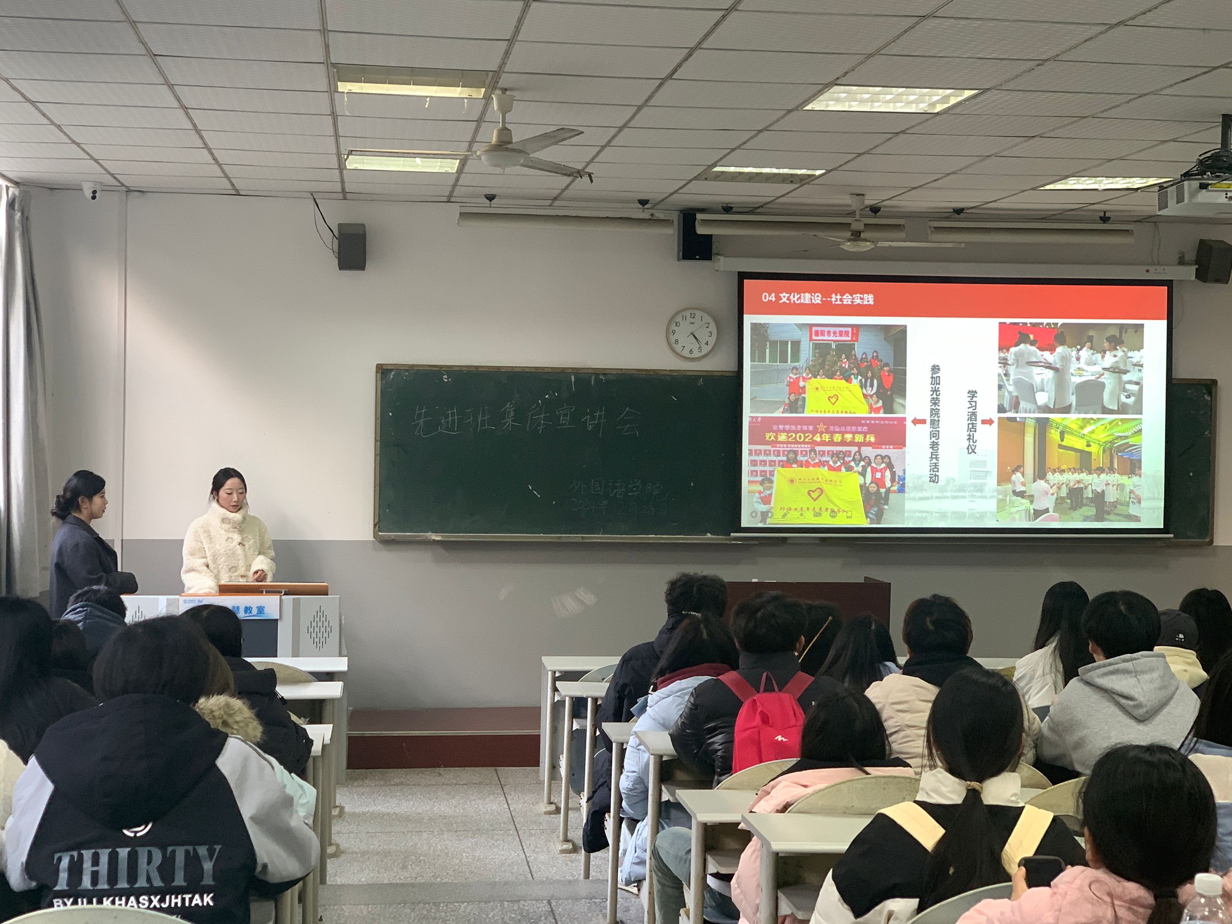 近日,外国语学院2023 级商务英语 1 班凭借出色的班级建设成果与优异的综合表现,荣获学校 2023 - 2024 学年度先进班集体称号。为充分发挥优秀班级的示范引领作用,促进学院班级建设的整体提升,2024 年 12 月 26 日下午 15:00,学院特别邀请该获奖班级面向大一大二全体班级举行了先进班集体宣讲会。此次宣讲会聚焦班级建设的关键领域,呈现了一场具有启发意义的经验交流盛宴。