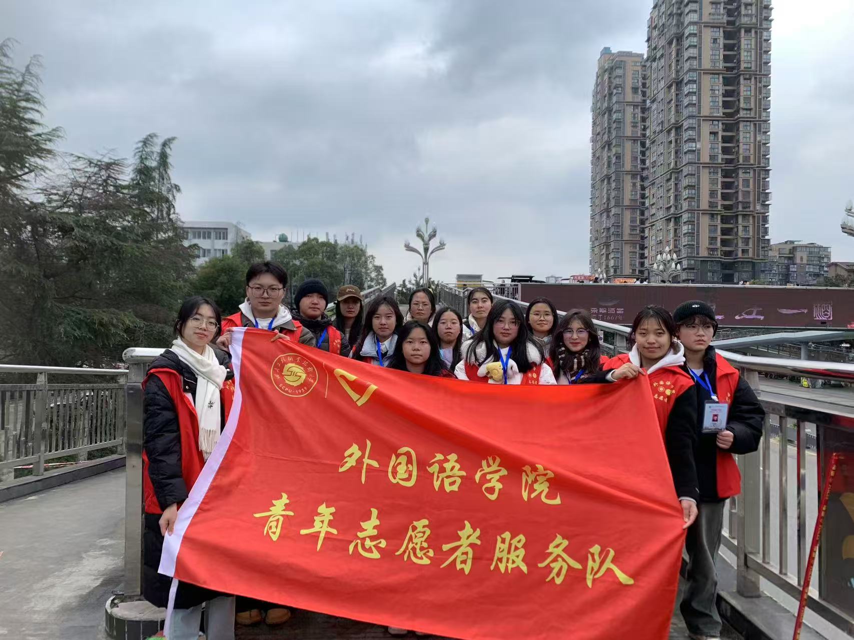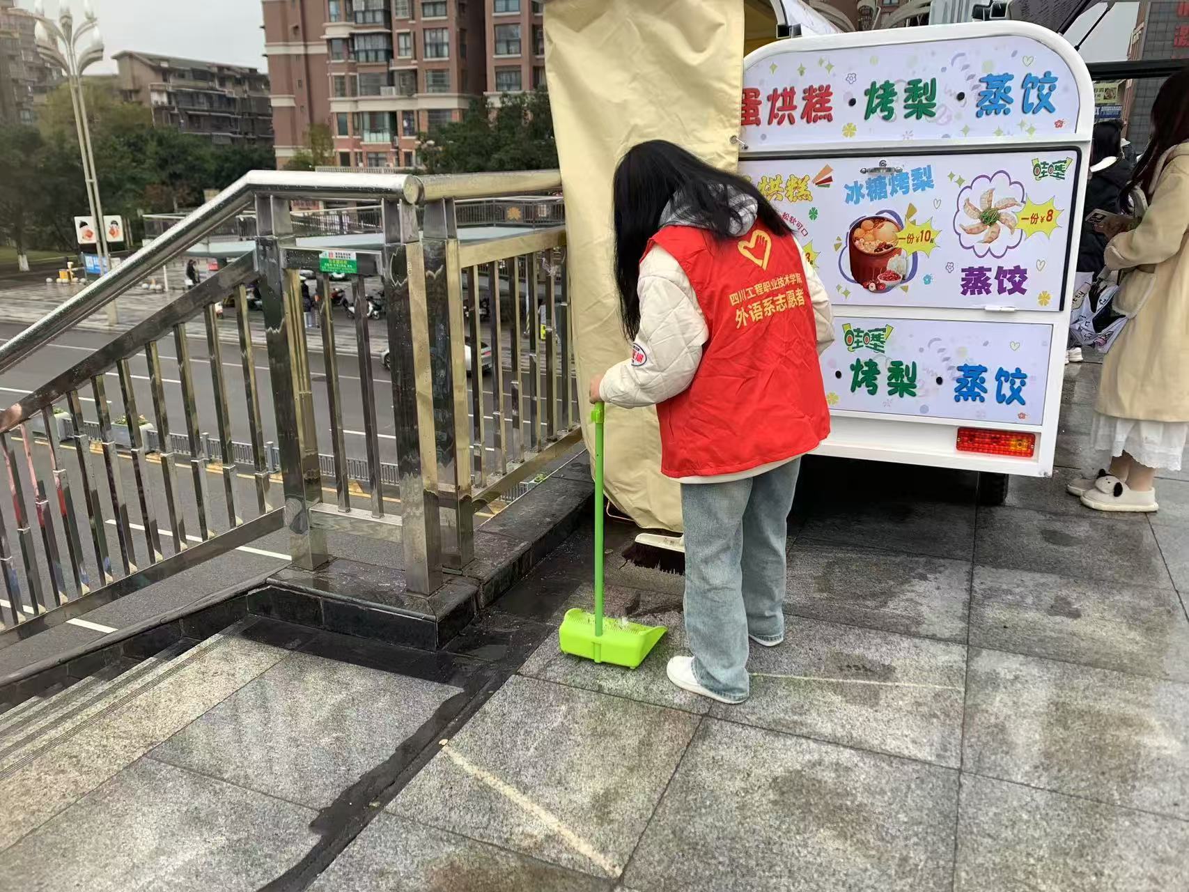 2024年12月8日中午,小雨淅淅,外国语学院的14名志愿者身着统一的红色志愿服,带着扫帚、垃圾袋等清洁工具,踏上了德阳市区的天桥,开展了一场以“文明天桥,文明出行”为主题的志愿服务活动。此次活动旨在通过实际行动,为市民提供更加整洁、安全的出行环境,同时传播环保与公益的正能量。