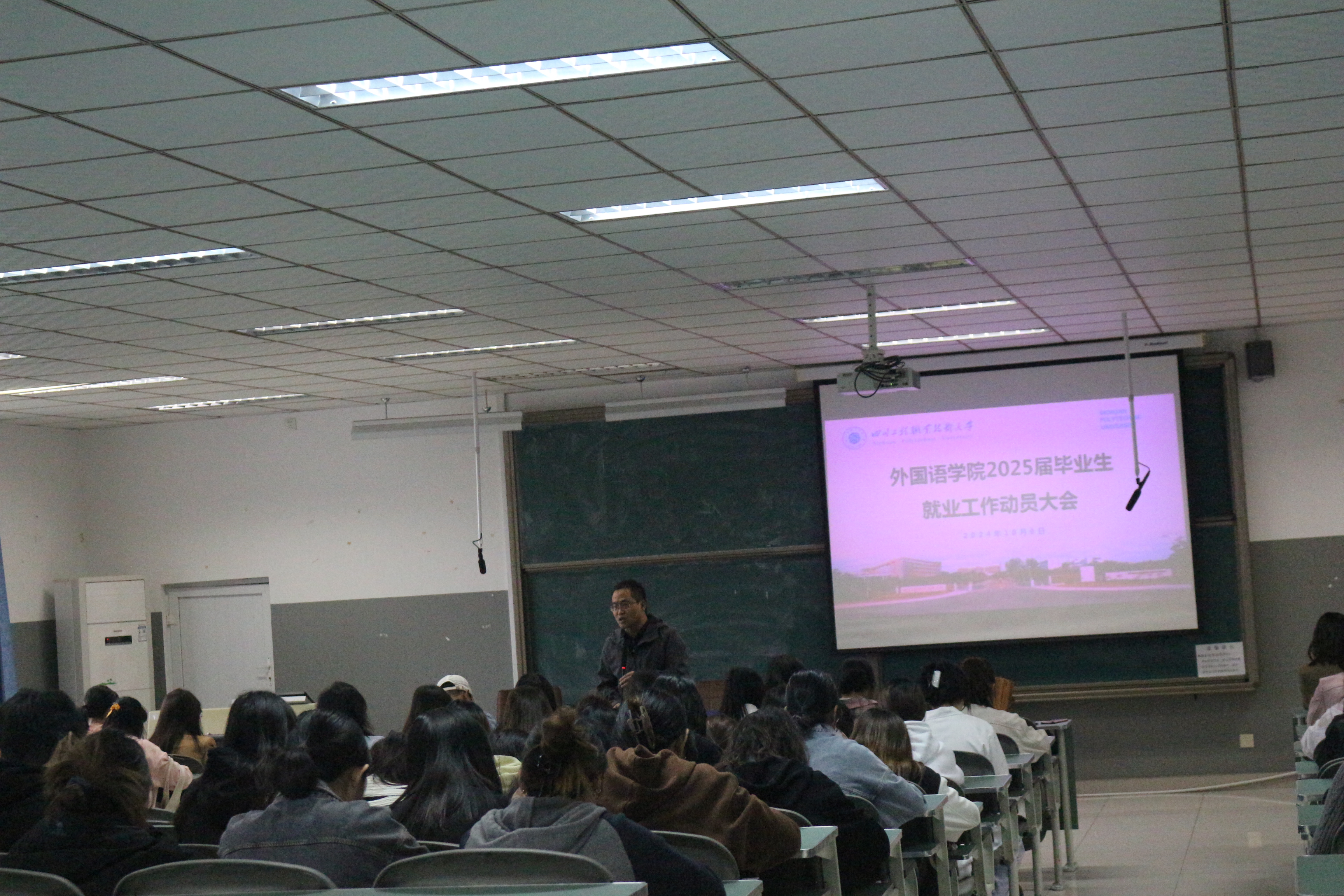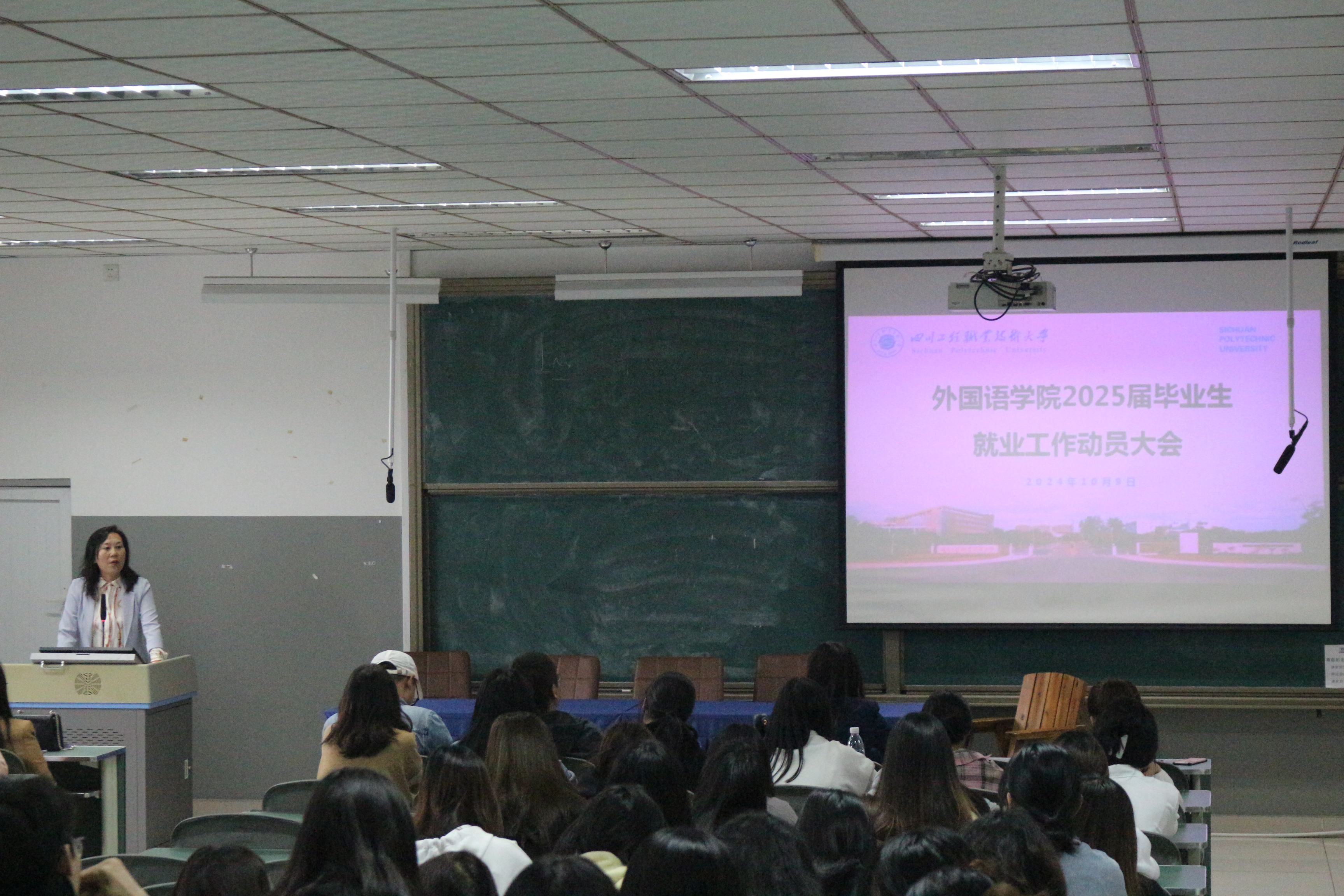 为帮助2025届毕业生深入洞察当前市场就业形势,进一步强化就业意识,提升就业能力,促进就业行动,10月9日下午4点20,外国语学院党总支在6B201召开2025届毕业生就业动员大会。学院张志友院长、党总支(主持工作)副书记高琦、何冬梅副院长、招就干事邓锋老师、毕业班学业导师、辅导员、岗位实习指导老师与学院全体2025届毕业生参加了本次动员大会。