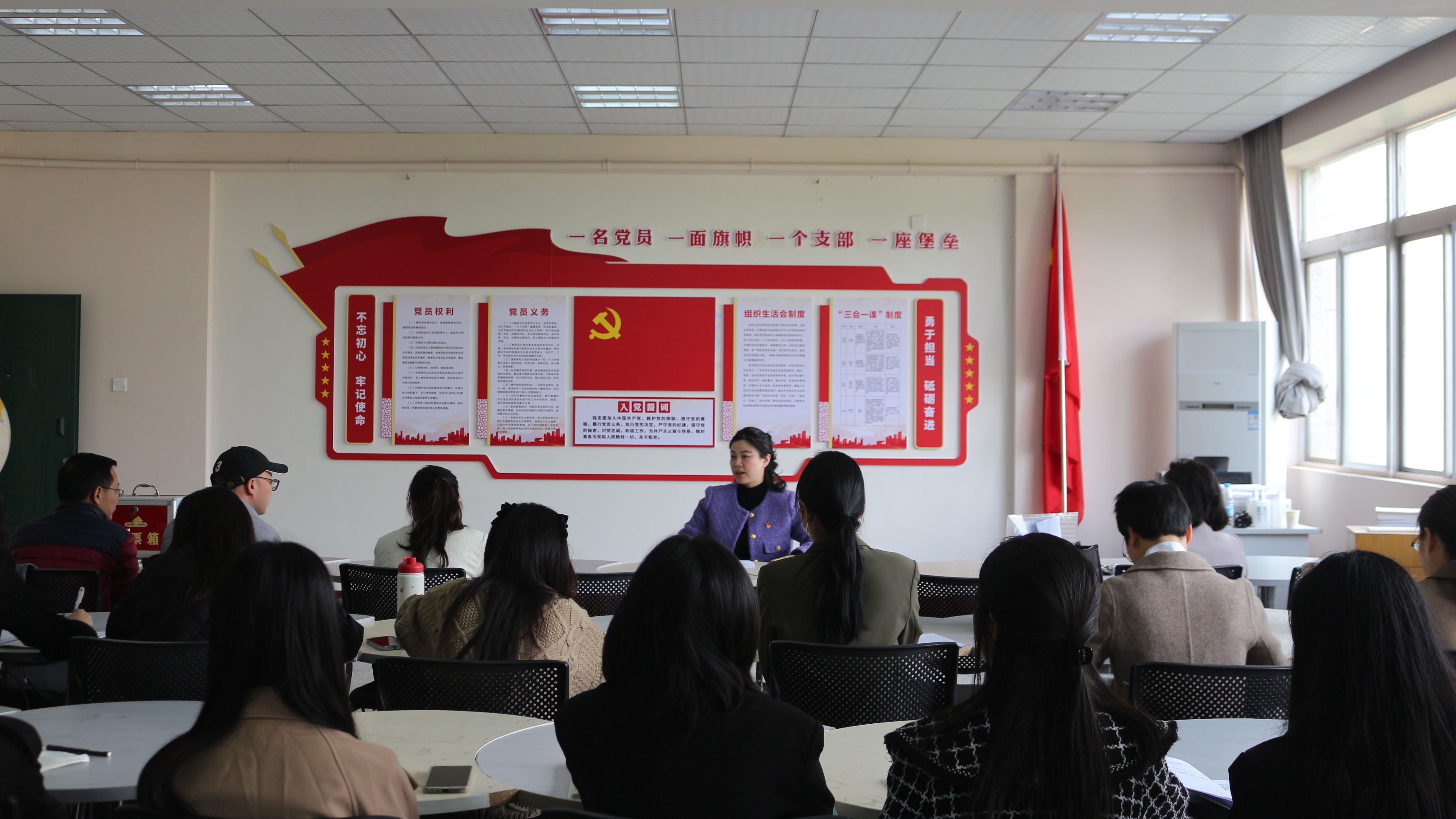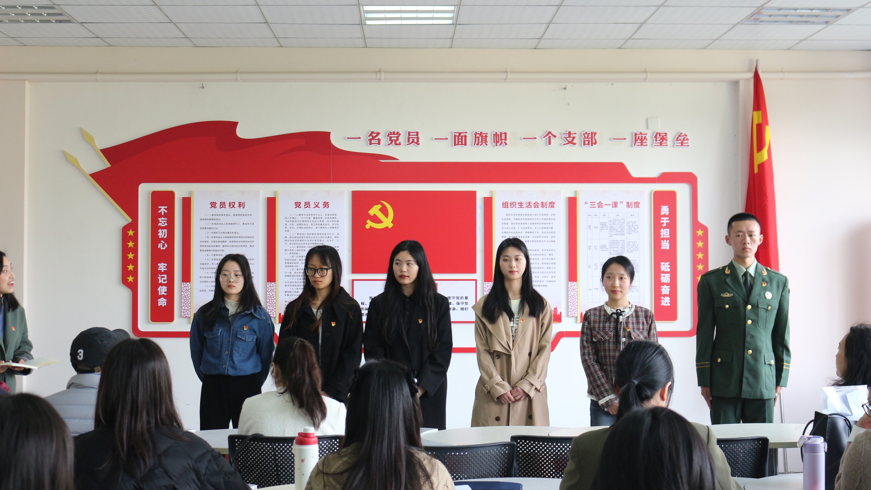 为进一步激励党员同志牢记职责使命,更好的发挥党员的先锋模范作用,3月16日下午3点,外语系预备党员入党宣誓仪式在二教307党建活动室举行。仪式由外语系党总支组织委员邓斯文主持,外语系党总支副书记(主持工作)朱英、商务英语专业党支部、应用英语专业党支部、大学外语党支部全体党员、预备党员以及入党积极分子代表参加了此次仪式。