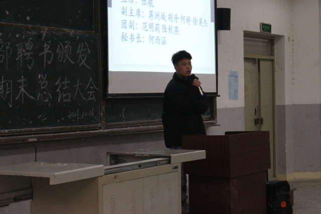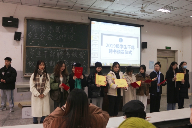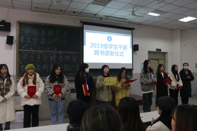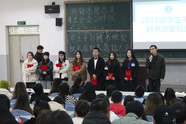 2021年12月16日下午16:30,外语系团总支学生分会2019级学生干部聘书颁发仪式及期末总结大会在3A109教室进行。外语系党总支书记王春焱、团总支书记唐蕊、辅导员胡晓老师以及外语系全体同学参加了此次大会。