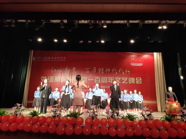 晚会在2020级应用英语1班合唱《少年》中拉开帷幕,同学用嘹亮的歌声歌唱祖国的大好山河,歌唱青春的朝气蓬勃。20级应用英语2班同学带来的情景剧《百年赞歌》,跨越百年,追溯星火,回忆一段段红色历史,谱写出一首百年赞歌。你还记得在稻田里追着蜻蜓的金色年华吗,还记得童年金色的梦吗, 19级应用英语2班带来的合唱《稻因你而香》,与观众席同学们手中挥舞的荧光棒一同完美的诠释了对于青春和梦想的热爱。19级商务英语1班带来的朗诵+合唱《少年的声音》,唱响了今日中国少年风貌。