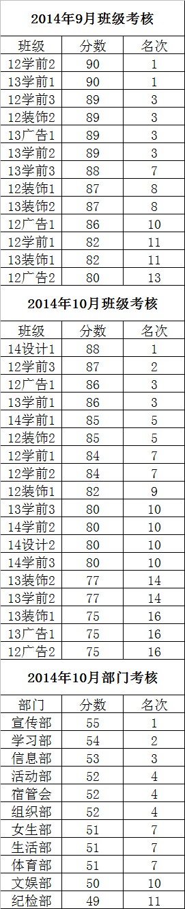 2014年9、10月班级及部门考核公示