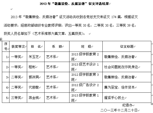 2013年“敬廉崇俭、反腐治奢”征文(院级)评选结果(艺术系部分)