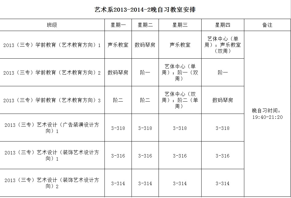 艺术系2013-2014-2晚自习教室安排