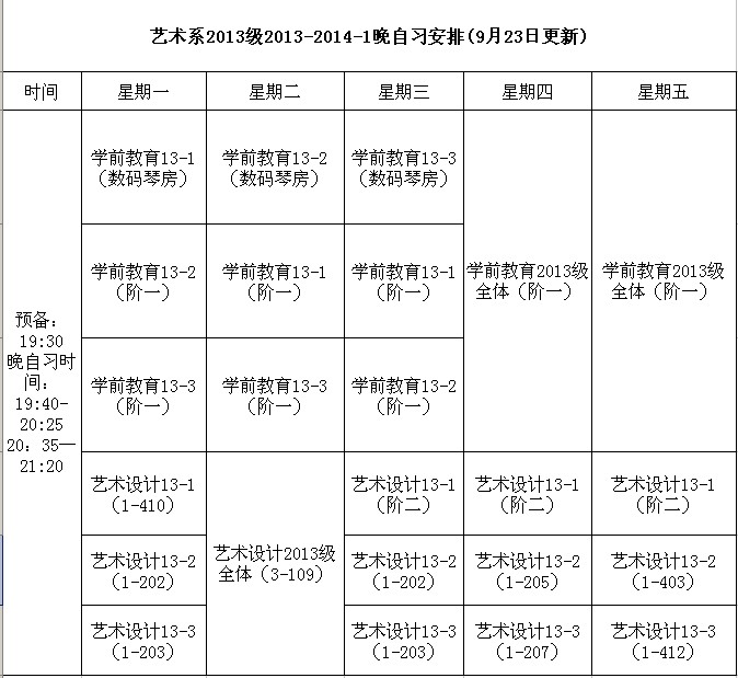2013级2013-2014-1晚自习安排(9月23日更新)