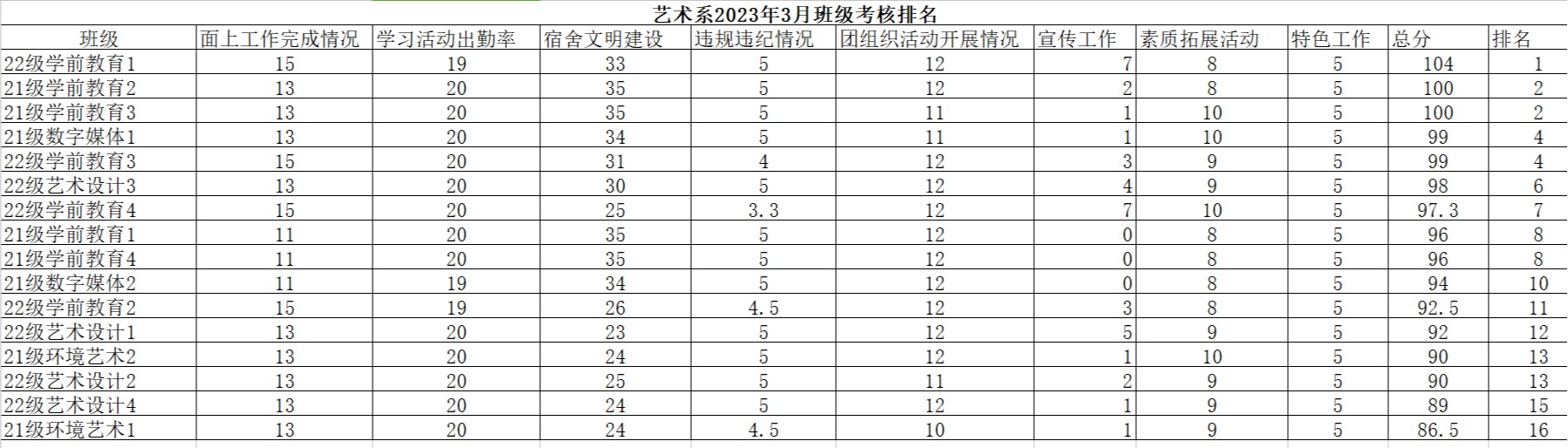 艺术系2023年3月班级考核排名