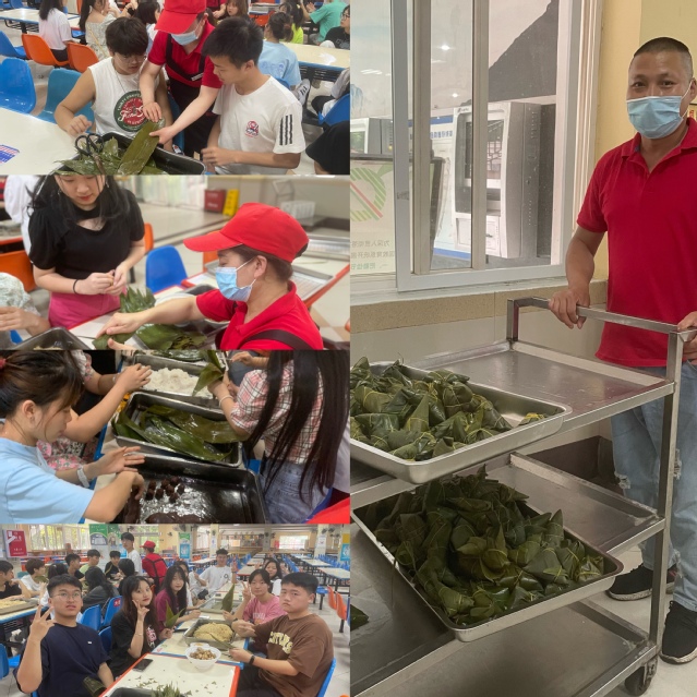 在旁观看的老师和同学们跃跃欲试。显然,包粽子看起来容易做起来难。虽然大家的技术水平参差不齐,无论是技术娴熟还是新手上路大家都特别开心,食堂里洋溢着欢声笑语。经过大家的辛勤劳作,几百个形态各异的粽子出炉了。最后,香粽分批次下锅,经历了1个小时的高温蒸煮,大家终于吃上了粽子。细腻软糯的粽子混合着竹叶的香甜,尝起来黏韧而清香,空气中散发着清爽甘醇的气息,香喷喷的粽子味道飘满整个食堂。