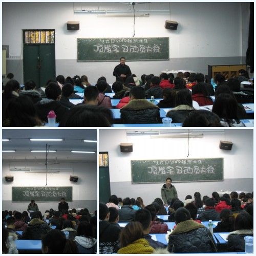2011年12月19日,大三全体学生及老师在旧图书馆阶梯教室2楼召开顶岗实习动员大会。会上丁艺老师讲了顶岗实习期间的要求和有关的问题,让我们更加清楚顶岗实习的重要性。接着王书记举例说明了一些关于顶岗实习的例子,让同学们知道在顶岗实习期间学生是具有双重身份的,要服从企业和学校对顶岗实习的安排和要求等。王书记还提醒大家注意毕业的相关事项,最后预祝09级的同学都能顺利的完成学业。