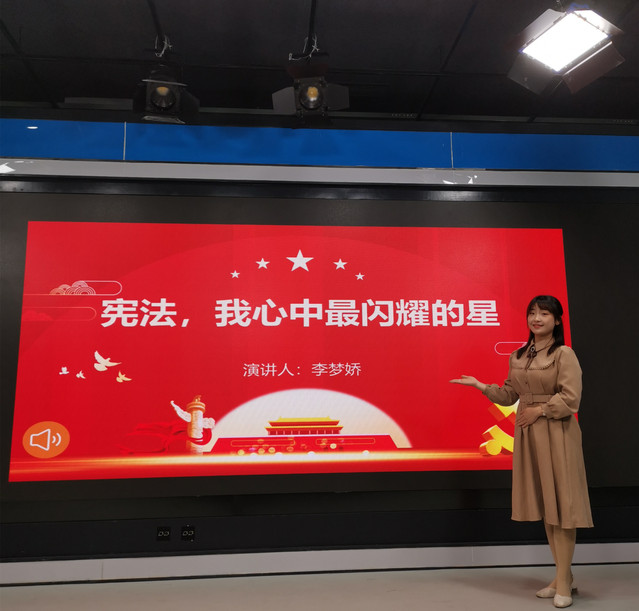 李梦娇同学在得知自己要代表系部参加校级总决赛时,非常激动,同时又倍感压力。经过认真写稿,多次找指导老师讨论,反复修改排练,最后确定演讲标题为《宪法,我心中最闪耀的星》。