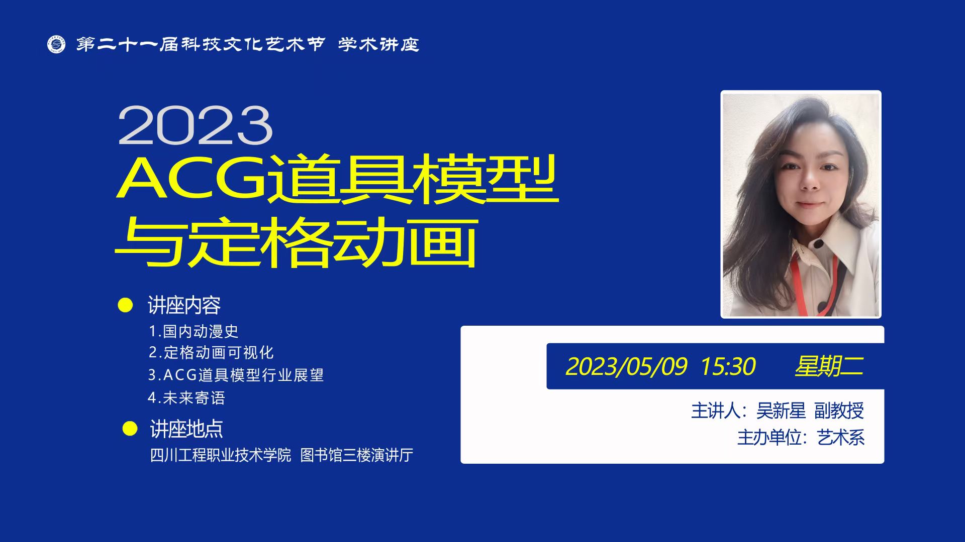2023年5月9日下午三点半,第二十一届科技文化艺术节系列活动“ACG道具模型与定格动画”主题讲座在学院图书馆三楼多功能演讲厅顺利举行。本次主题讲座是由艺术系承办,由环境艺术设计教研室吴新星副教授主讲。我系全体老师及全校学生代表参加了本次讲座,讲座由系主任丁艺主持。