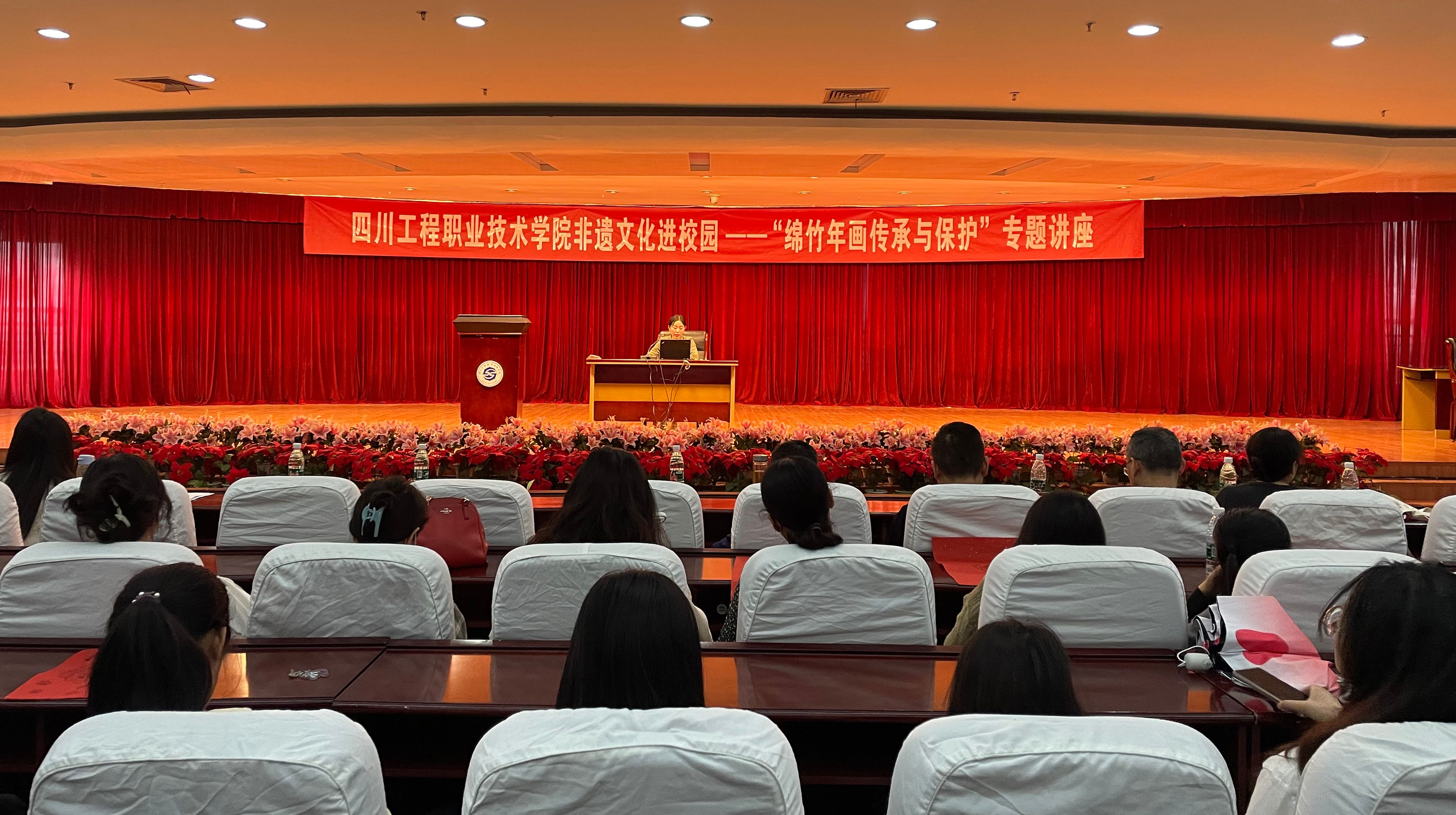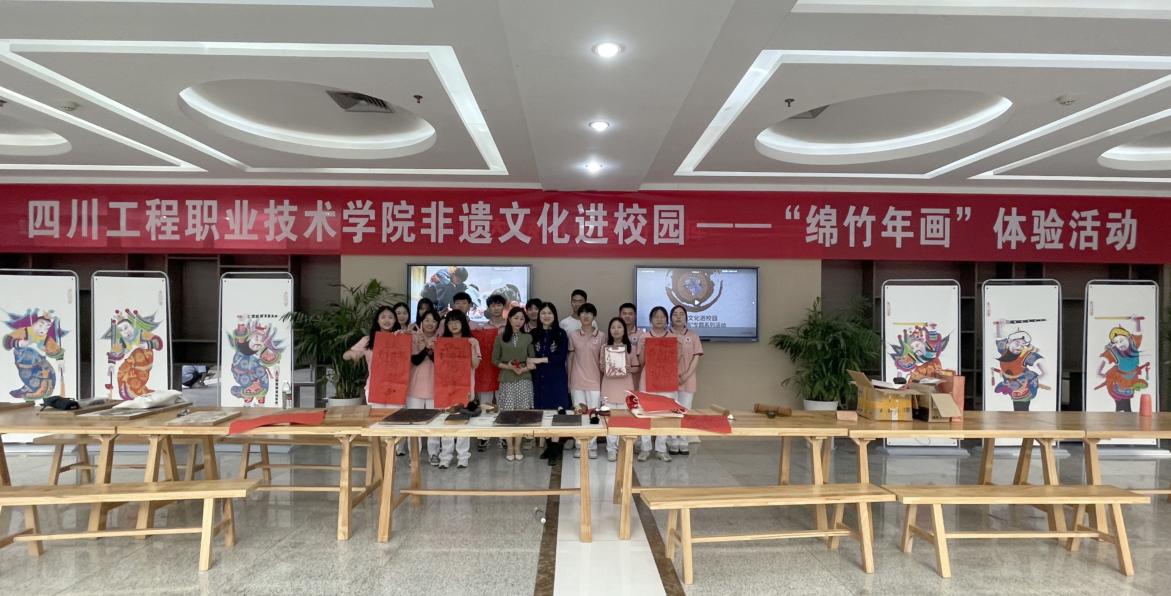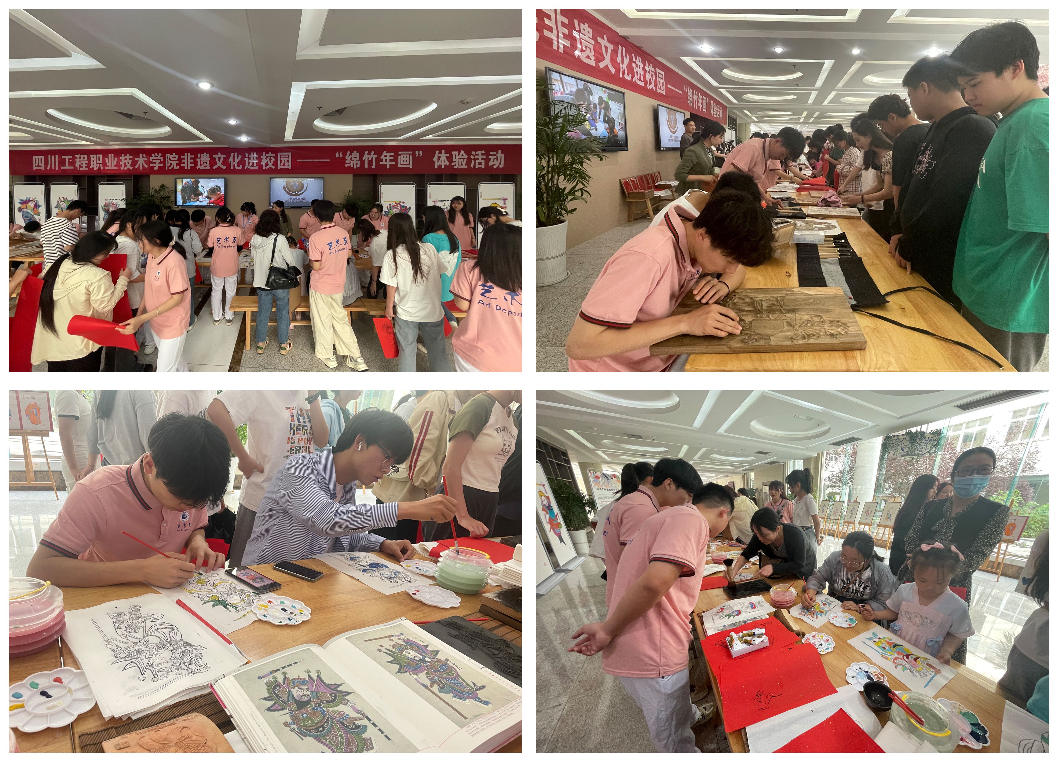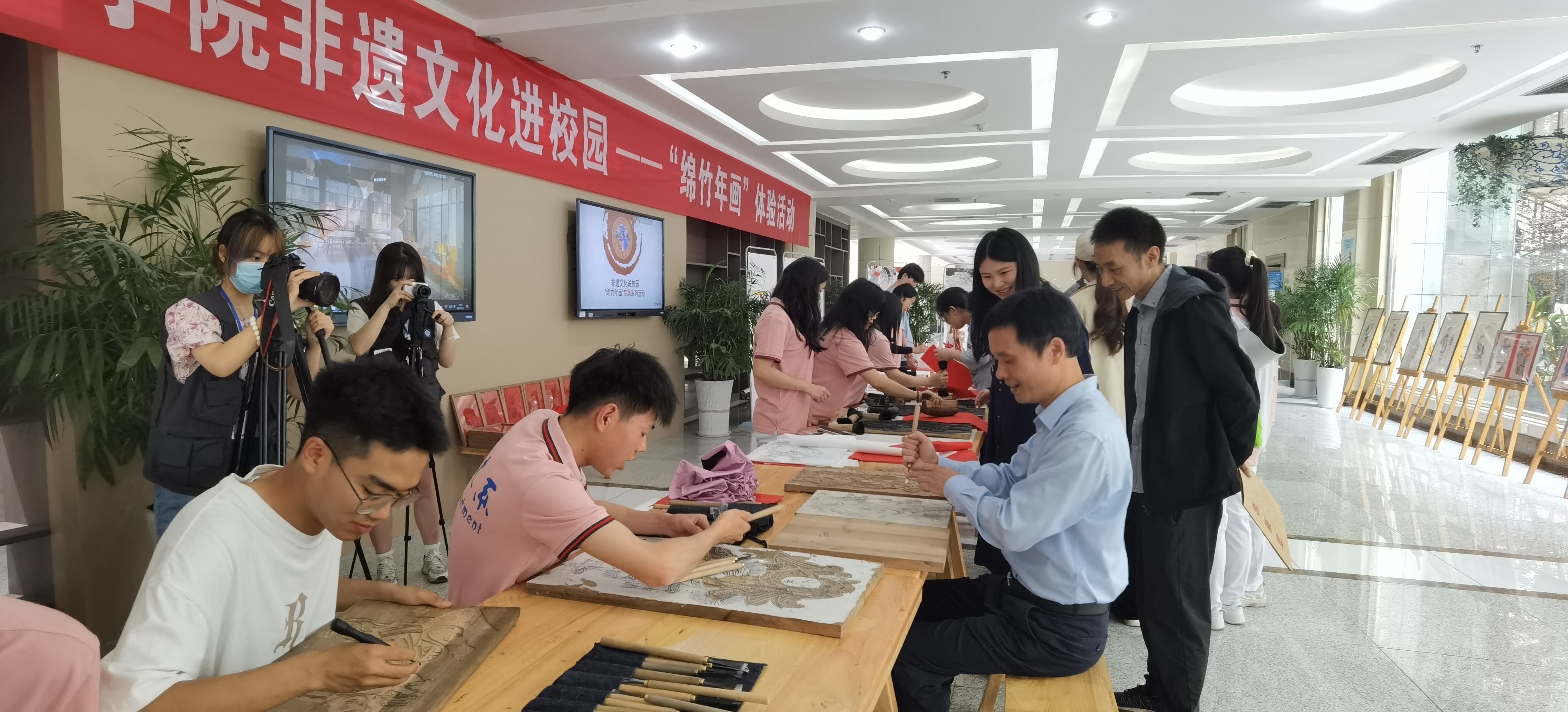 5月23日,在文化和自然遗产日临近之际,由艺术系承办的四川工程职业技术学院“非遗文化进校园”绵竹年画专题系列活动启动仪式暨首场活动在图书馆举行。四川工程职业技术学院党委副书记郑辅春、党委常委王静、艺术系书记杨晓蕾、艺术系主任丁艺,以及来自学院各院系师生共500余人参与活动。