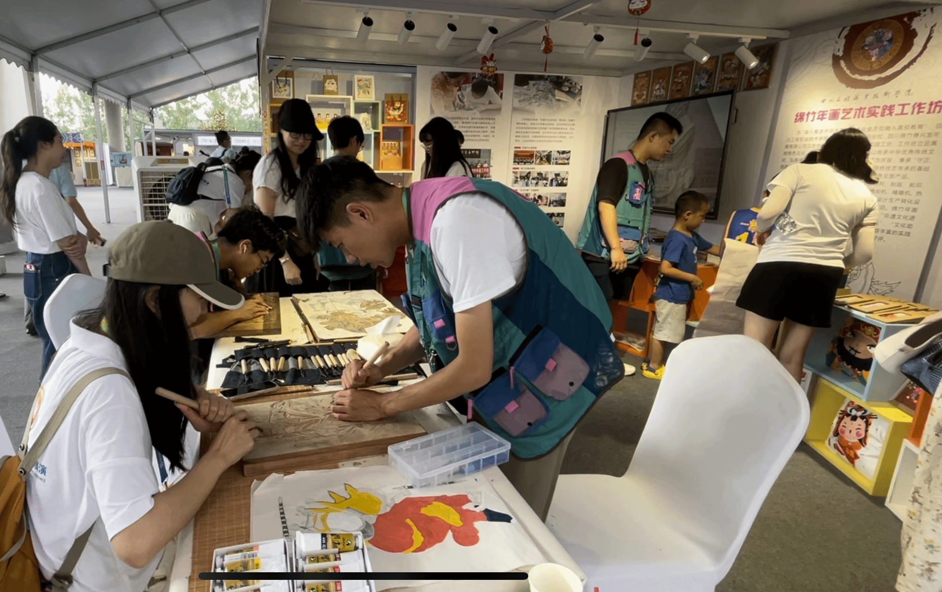 “哇,这个太有意思了!”“这个是怎么刻的呀,我可以试试吗?”“我也要印两张财神带回家!”“这个是印章吗,这个太可爱了吧!”“你们做的这个好有意义啊!工作坊展区现场我校展位观者云集,观众参与度空前高涨,大家在工作坊师生的指导下体验刻版、拓印、施彩等传统技艺,对工作坊师生开发设计的很多文化创意产品爱不释手。