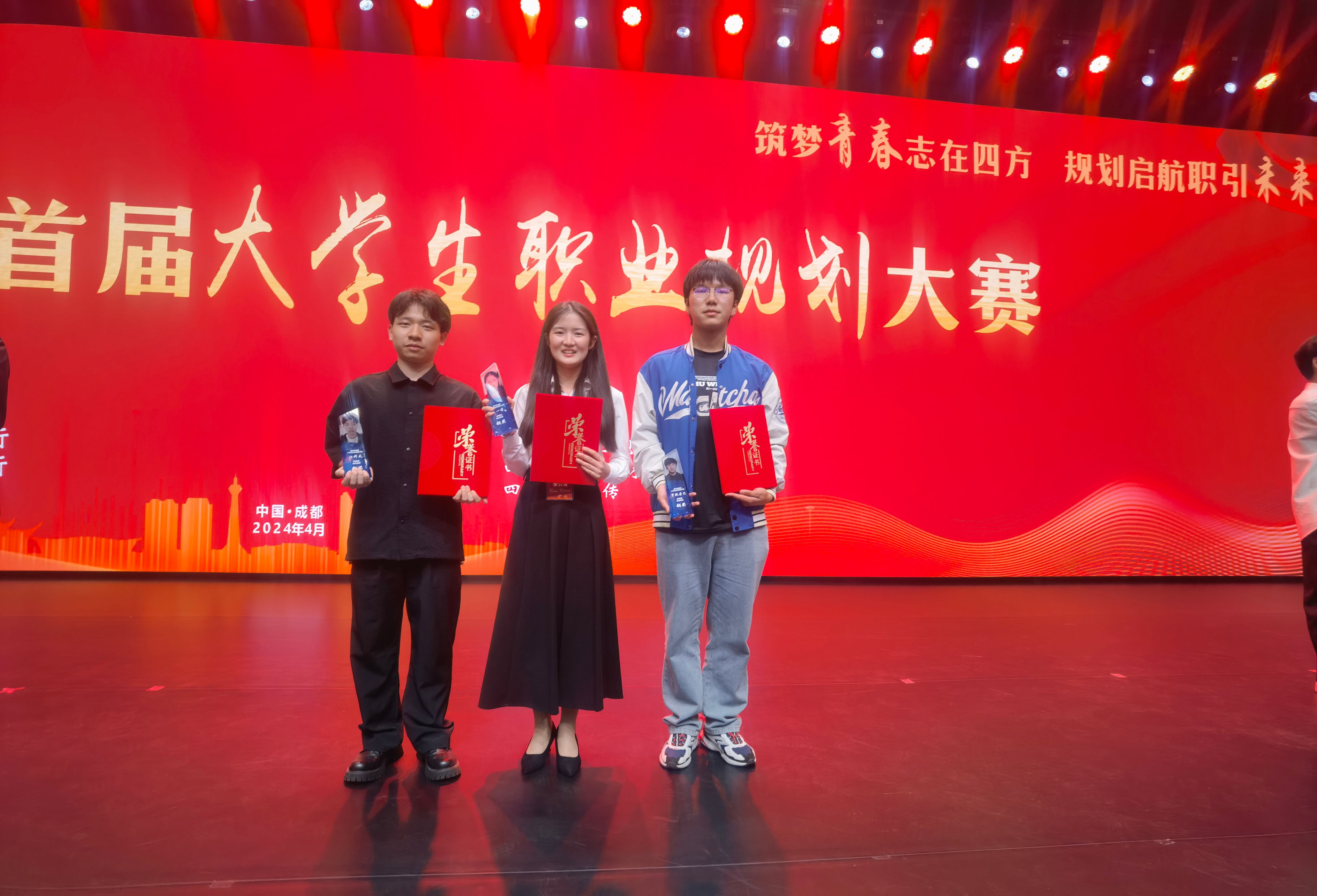 4月12日,四川省首届大学生职业规划大赛展演活动在四川传媒学院举行,我系学生王一倩、江科成、罗绒丹巴受邀参加此次展演活动,王一倩、江科成作为获奖代表参加颁奖环节。