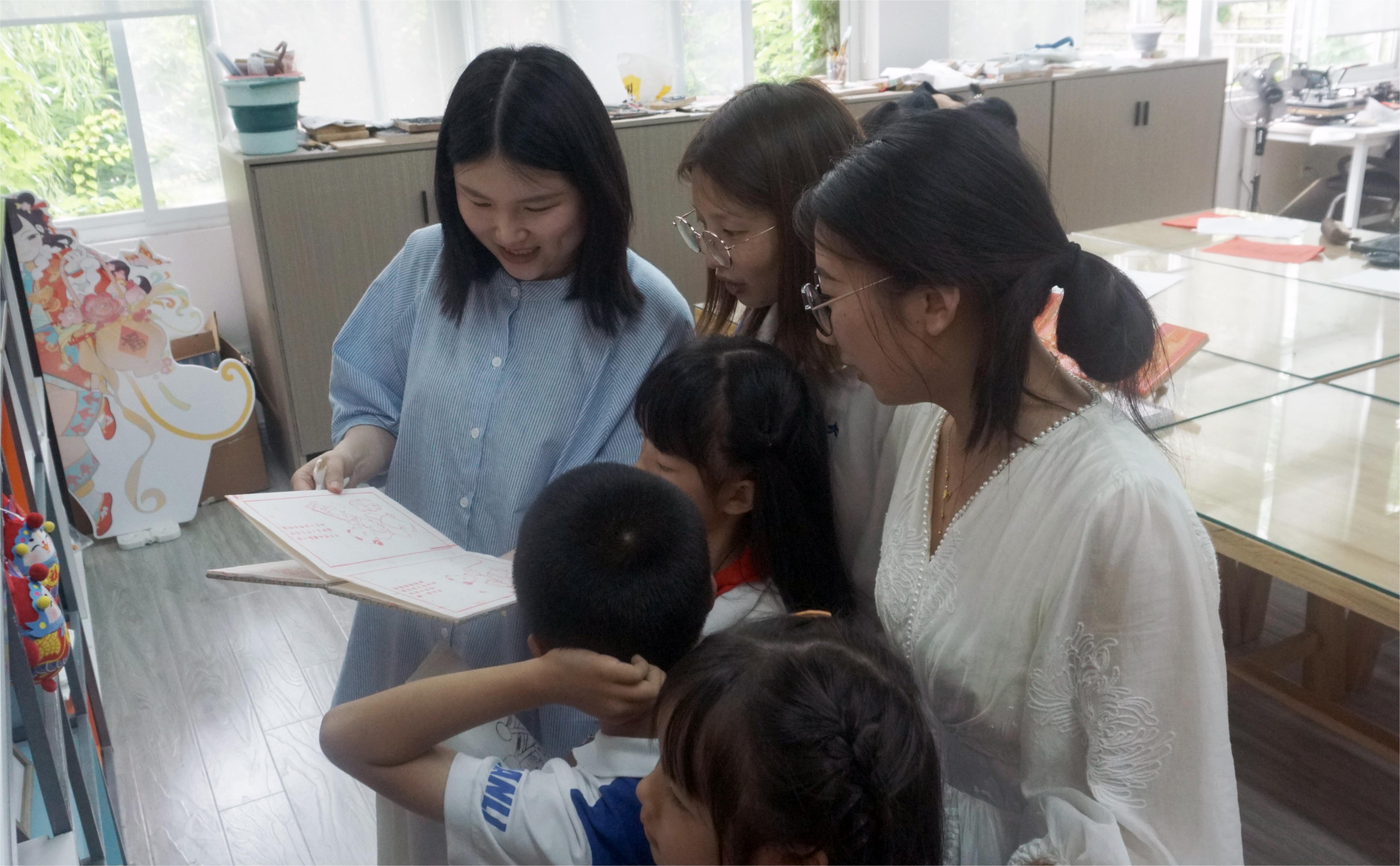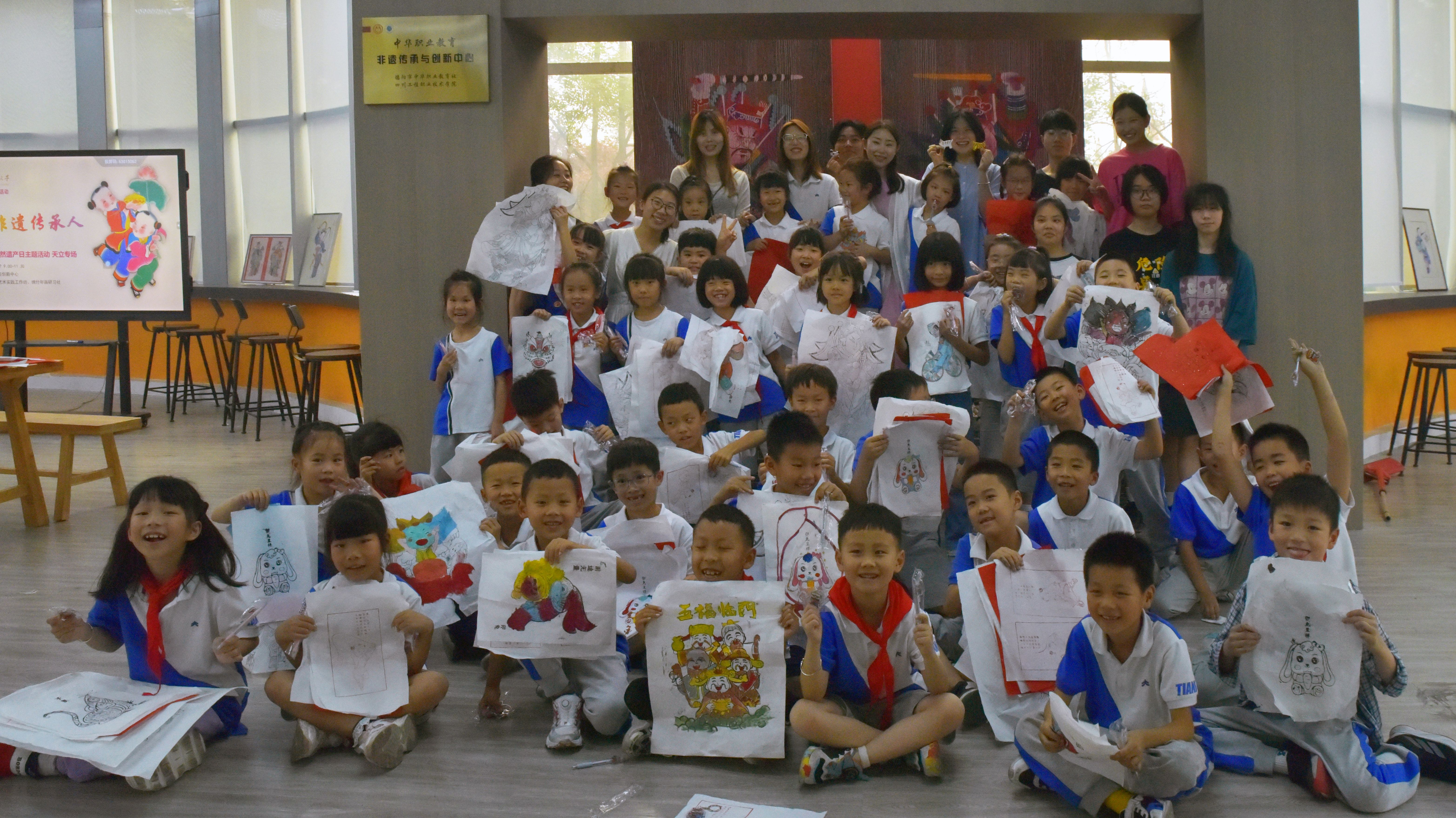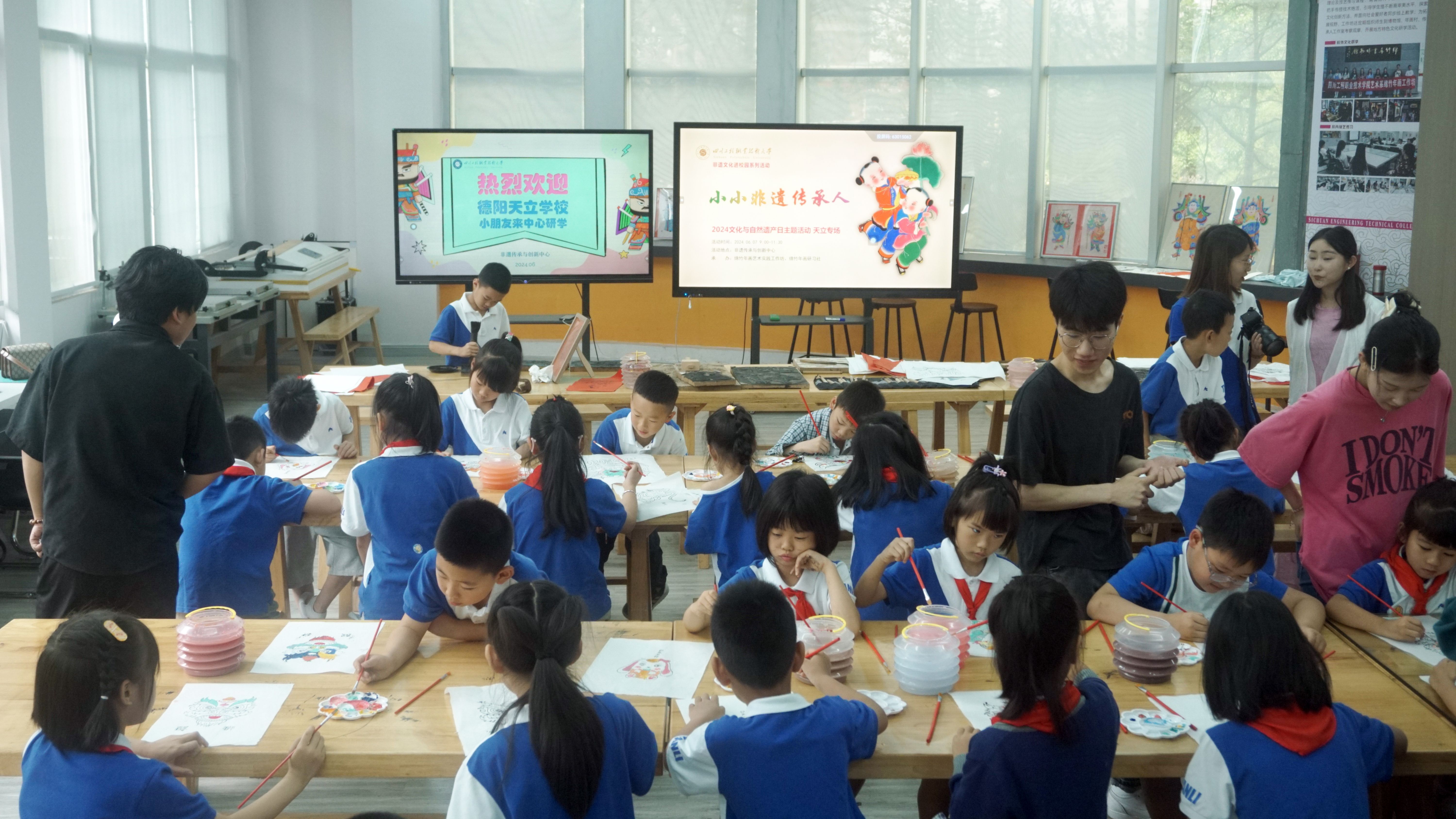 小朋友们在艺术学院教师余婞的带领下参观了非遗中心。通过余老师的介绍,他们了解到德阳的非遗文化丰富多样,不仅有中国四大年画之一的首批国家级非遗项目绵竹年画,还有德阳潮扇、马祖农禅棕编、汉州面具、汉州剪纸、汉州蜀绣等诸多非遗项目。非遗代表性传承人张琴为小朋友们展示传统绵竹年画作品,通过张老师的讲解,孩子们对绵竹年画的历史渊源、工艺流程与美学特征有了初步的了解。